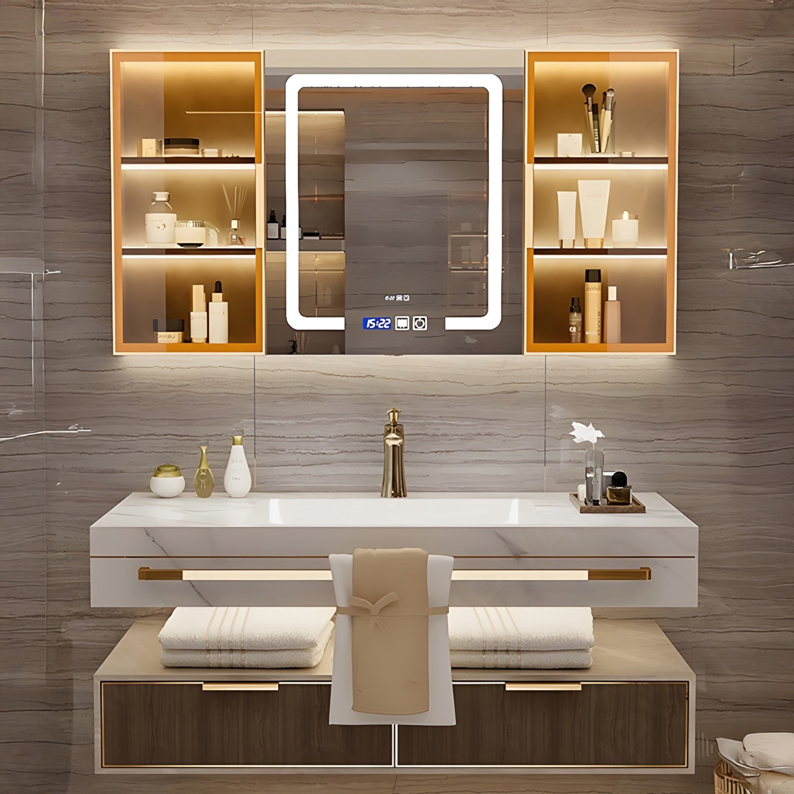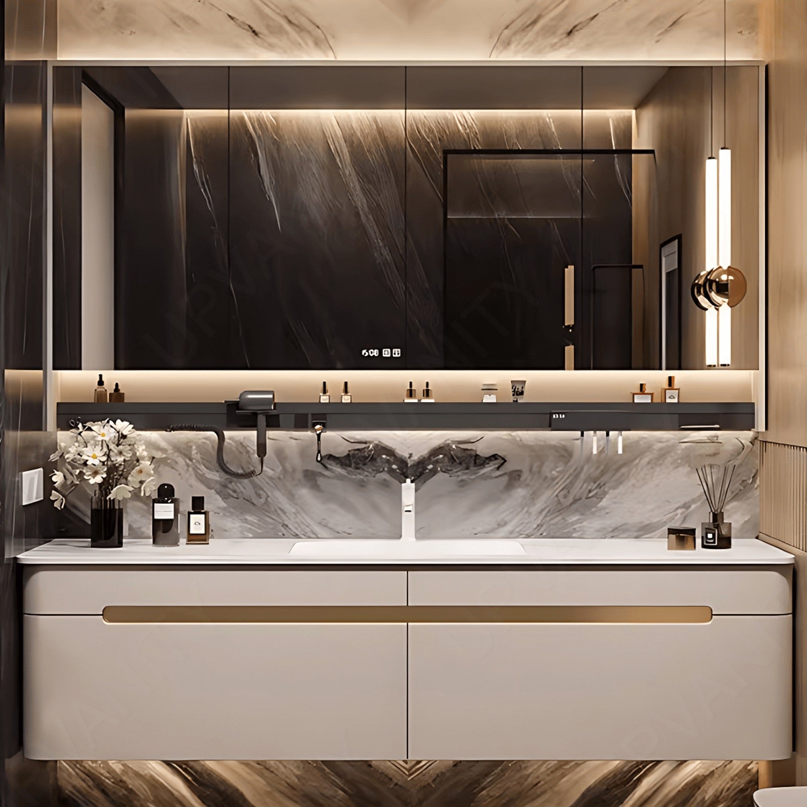 Elegant Bath Vanity Set, White, Gold Accents, 52"-78", Double, Floating, Sectional Storage, Dual Smart LED Mirror