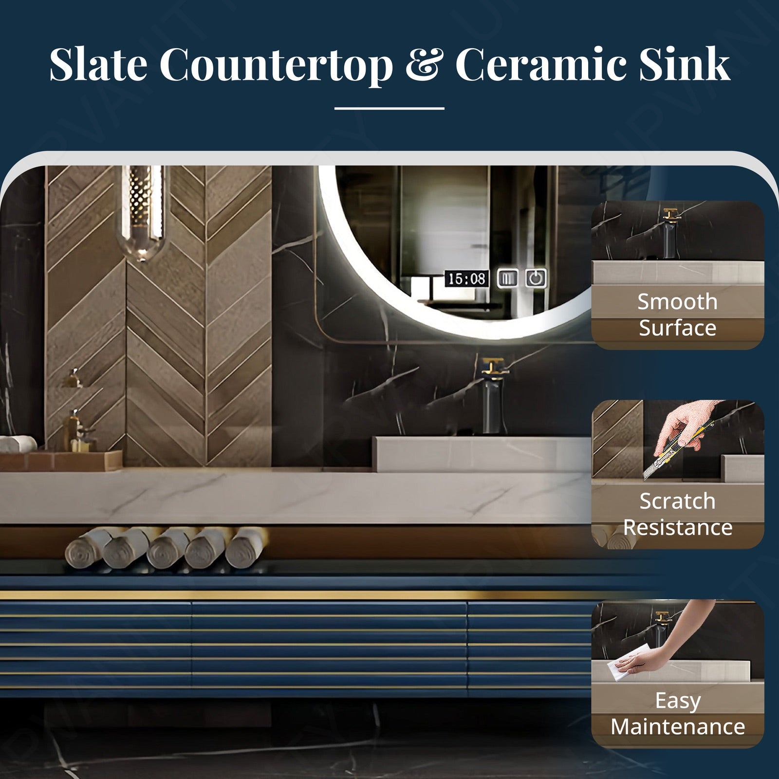 We are so happy with our vanity purchase, the Elegant Bath Vanity Set Brown-Warm Walnut, 84 inches. The vanity and countertop are of excellent quality and the smart LED mirror is fantastic.