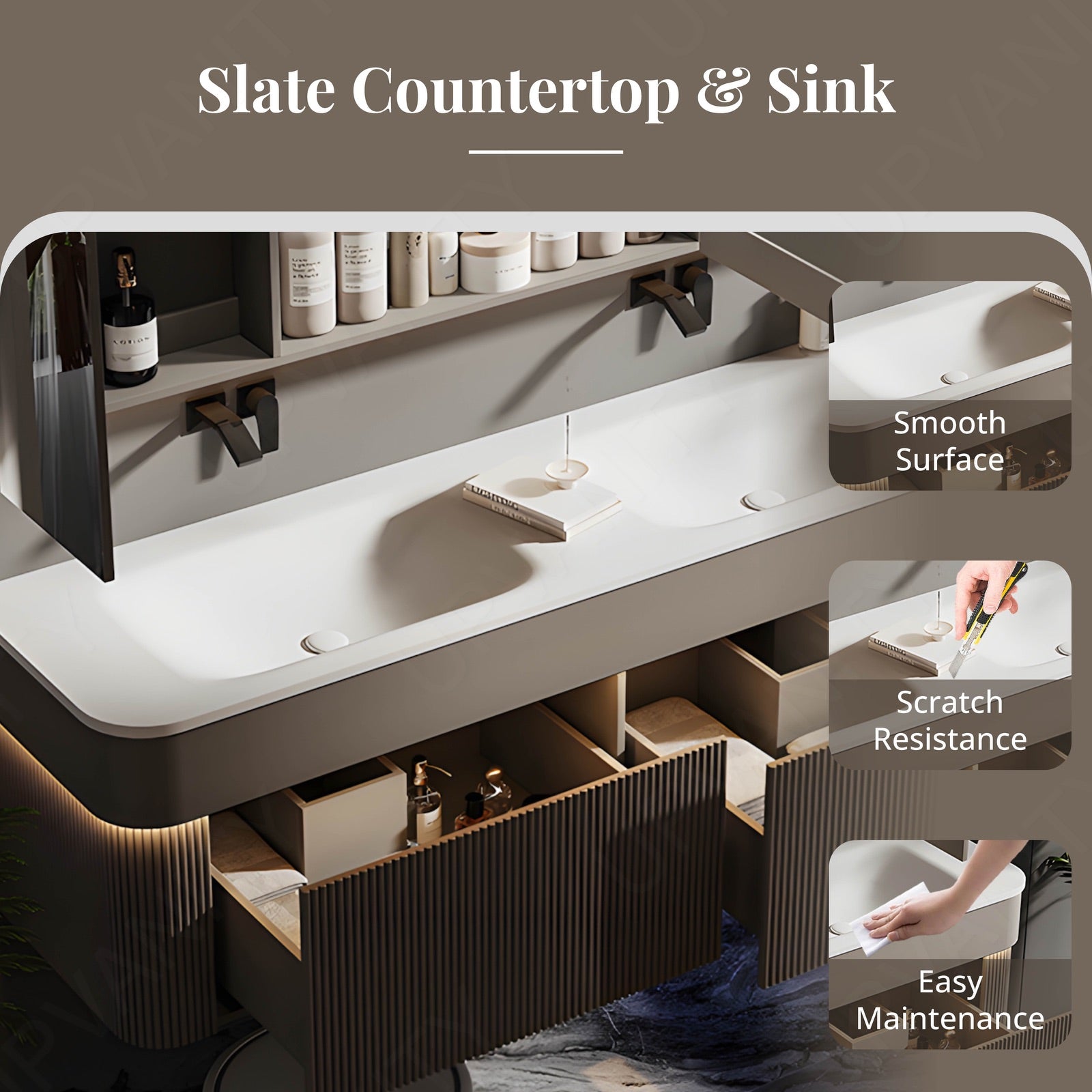 The white slate top offers a clean, modern surface that complements the overall design, ensuring durability and a sleek appearance for your bathroom.