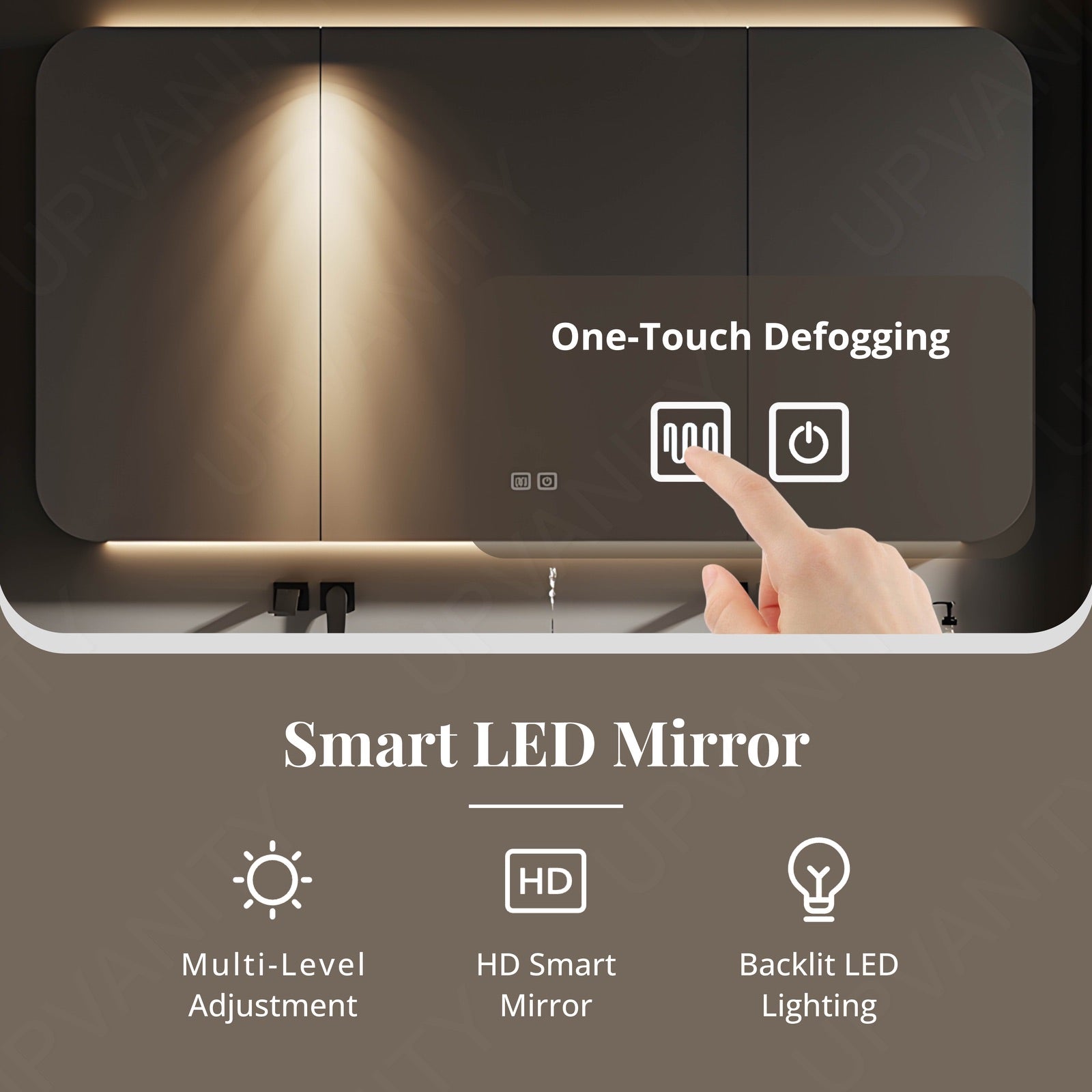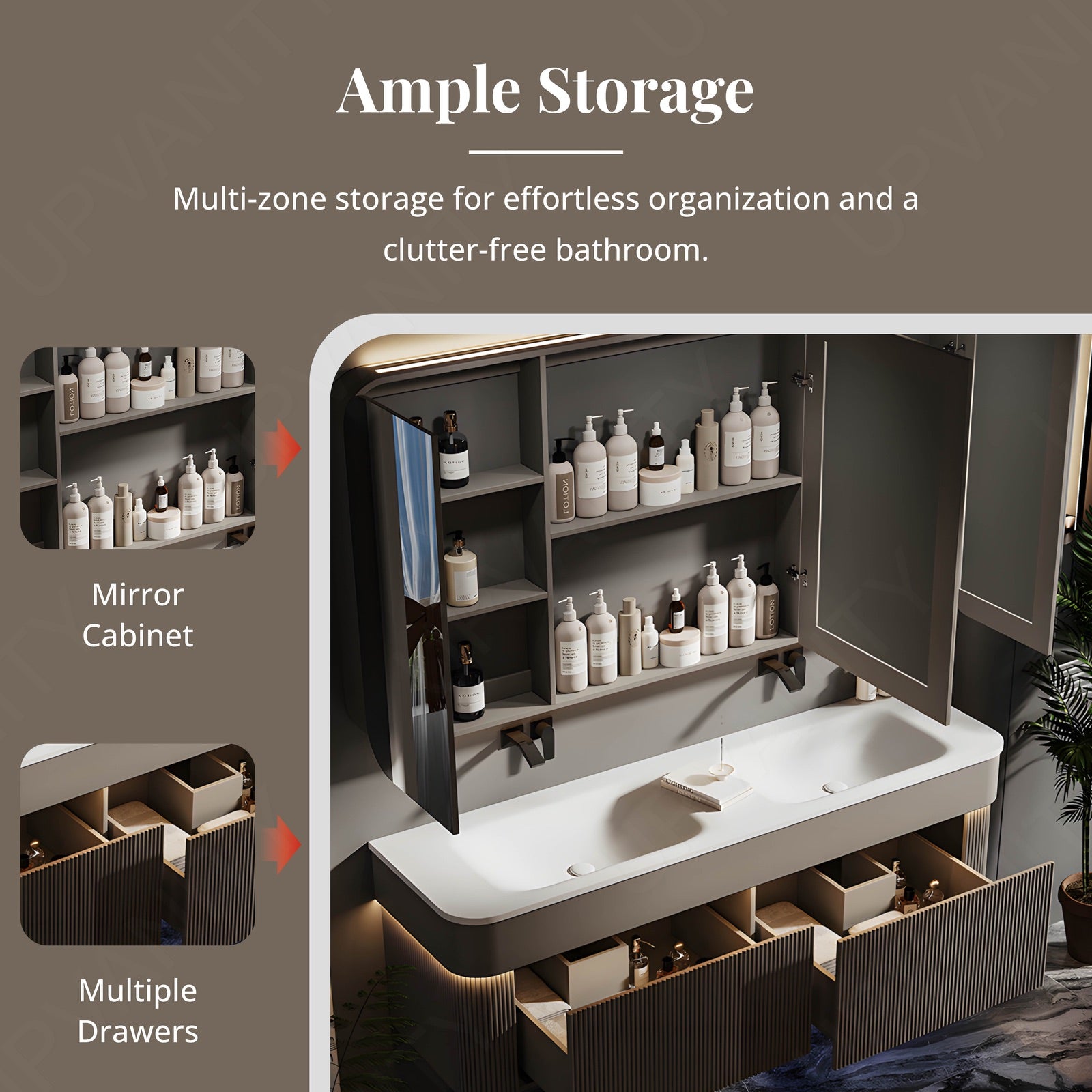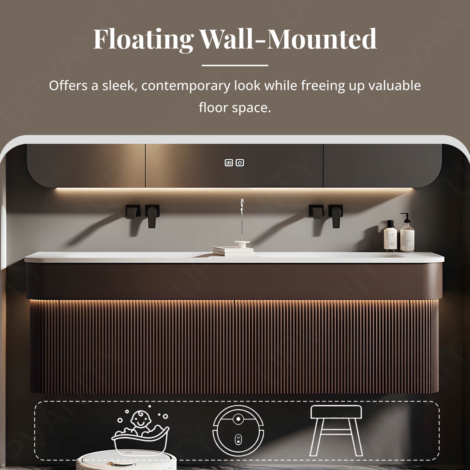 Featuring a smart LED mirror with sensor lighting, this vanity enhances visibility and ambiance, making your daily routine more efficient and enjoyable.