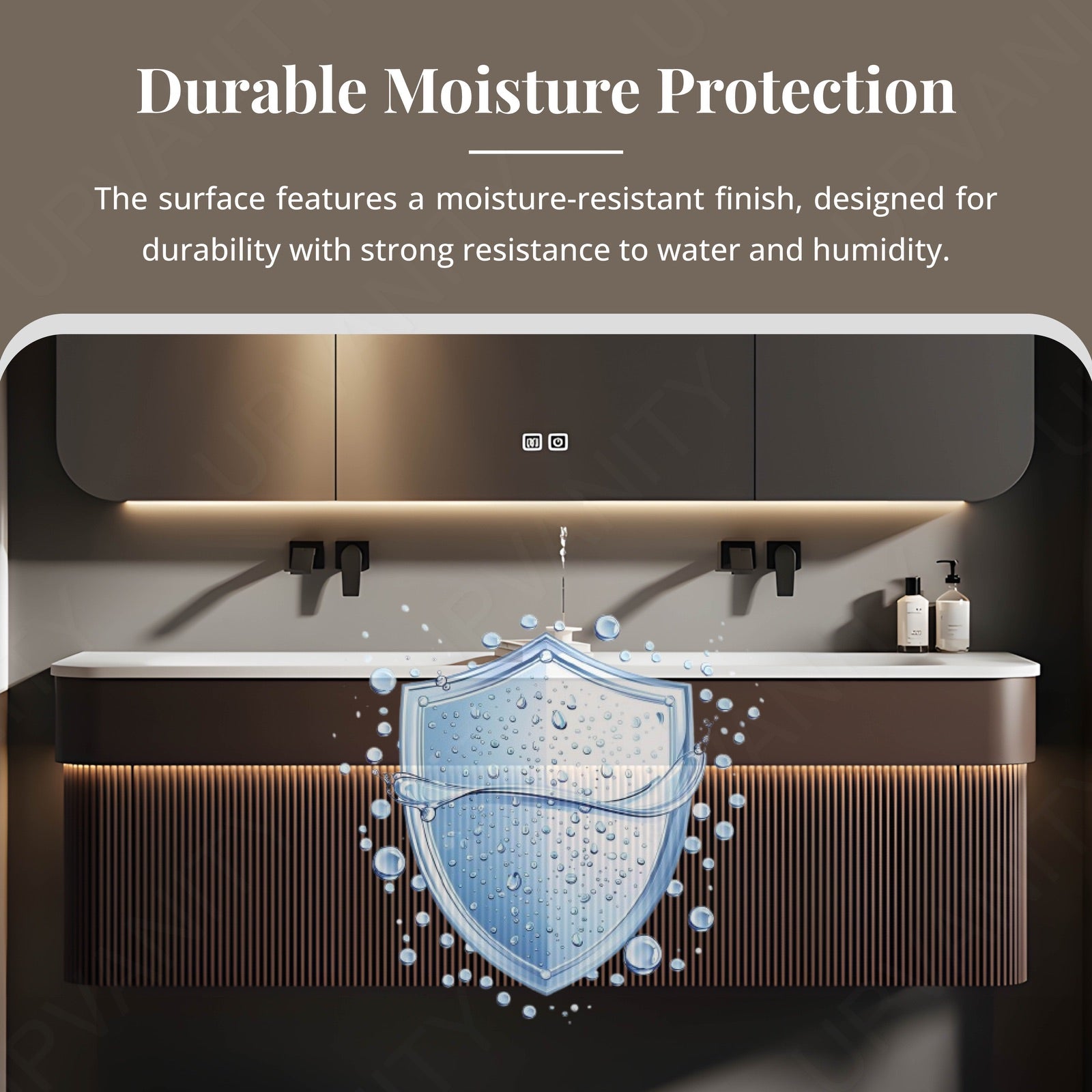 The brown striped panels deliver a unique, textured look, adding warmth and sophistication to your bathroom while making a striking visual impact.