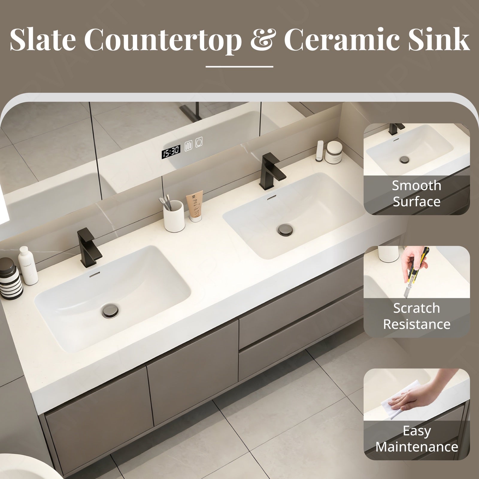 The Elegant Bath Vanity Set in brown combines modern sophistication with practical functionality. Its floating design and hidden storage create a striking focal point. The smart LED mirror and rear cabinet enhance lighting and storage. Made from premium solid wood, this durable piece offers a timeless aesthetic. Elevate your space with its bold design and ample storage for style and organization.