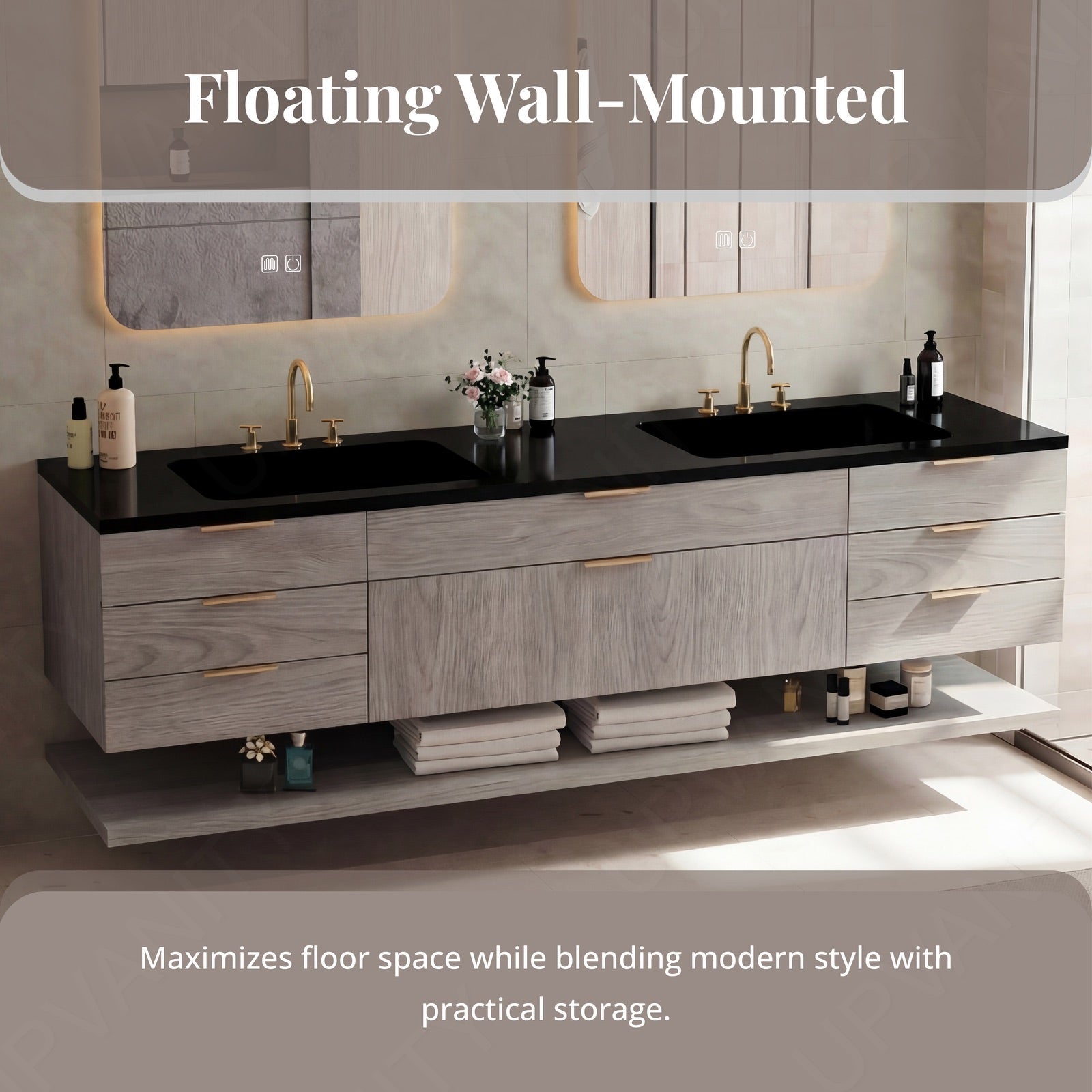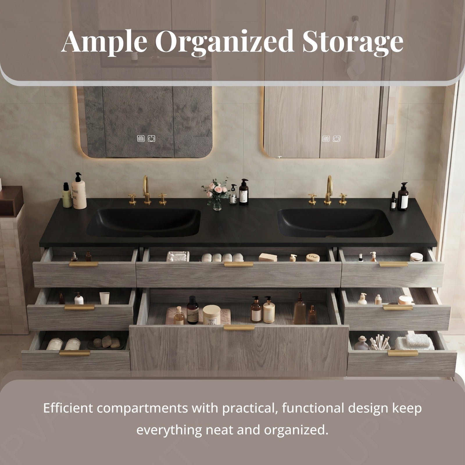 The gray elegance of this bath vanity set shines through its white slate top, complemented by luxurious gold accents for a sophisticated touch. Available in sizes from 52" to 78", it features a double sink configuration and a floating design that enhances space efficiency. Dual smart LED mirrors offer advanced lighting and defogging technology, ensuring clarity and convenience. Crafted from premium materials, this vanity set seamlessly blends style and functionality, perfect for elevating any modern bathroom setting.