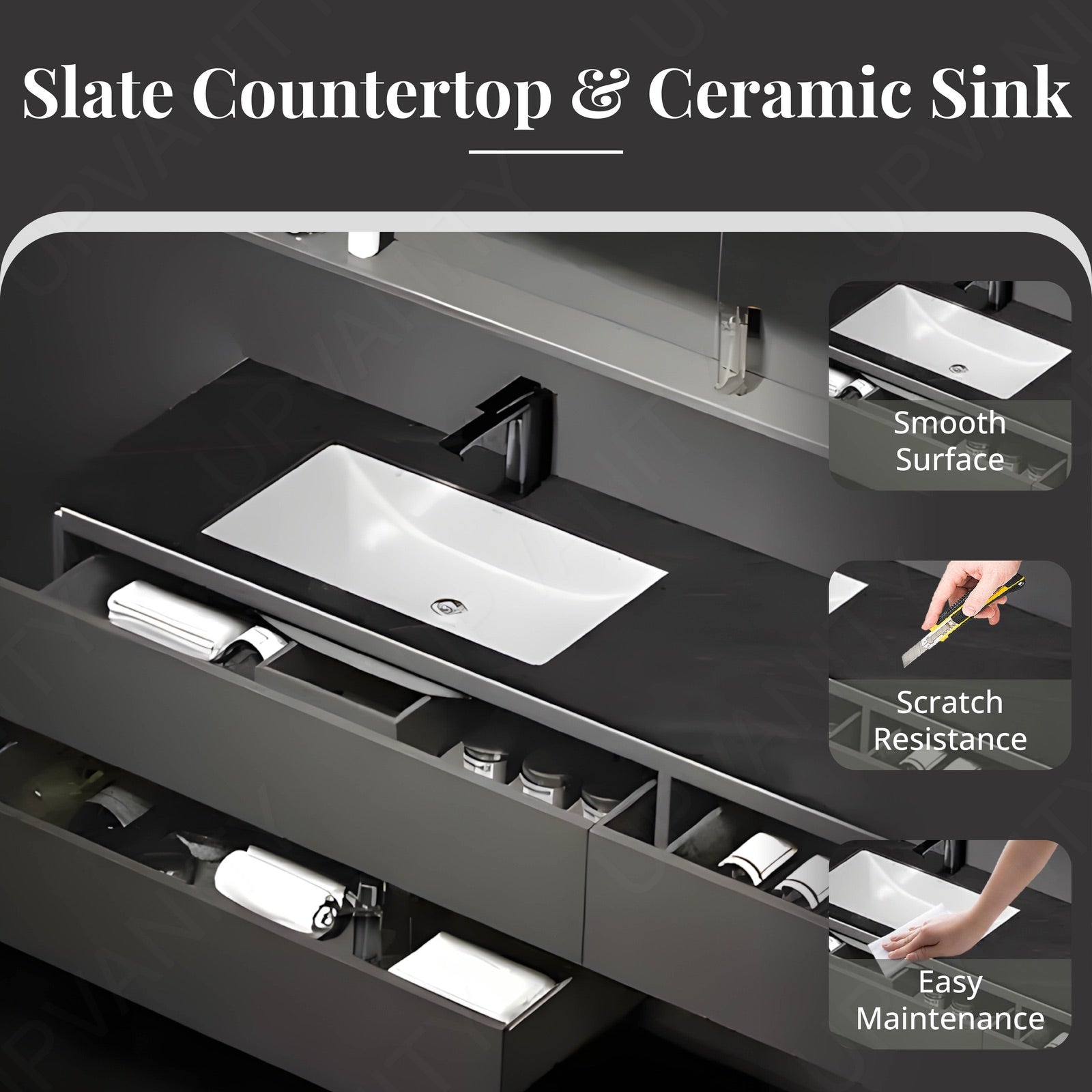 The black slate top adds a sophisticated touch, creating a bold and luxurious aesthetic that enhances any bathroom decor.