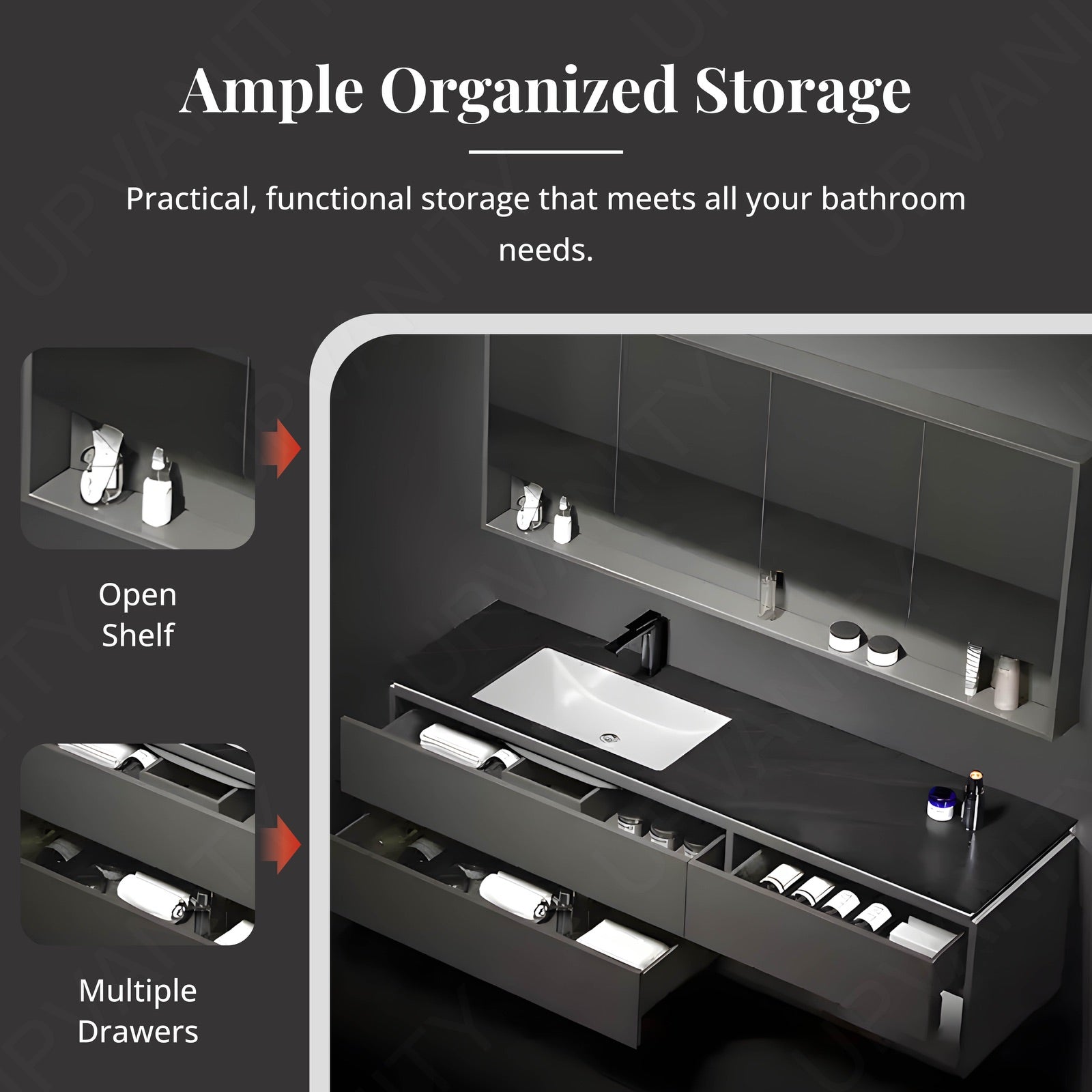 The rear cabinet provides additional compartments for toiletries and daily use items, ensuring your bathroom remains organized and clutter-free.