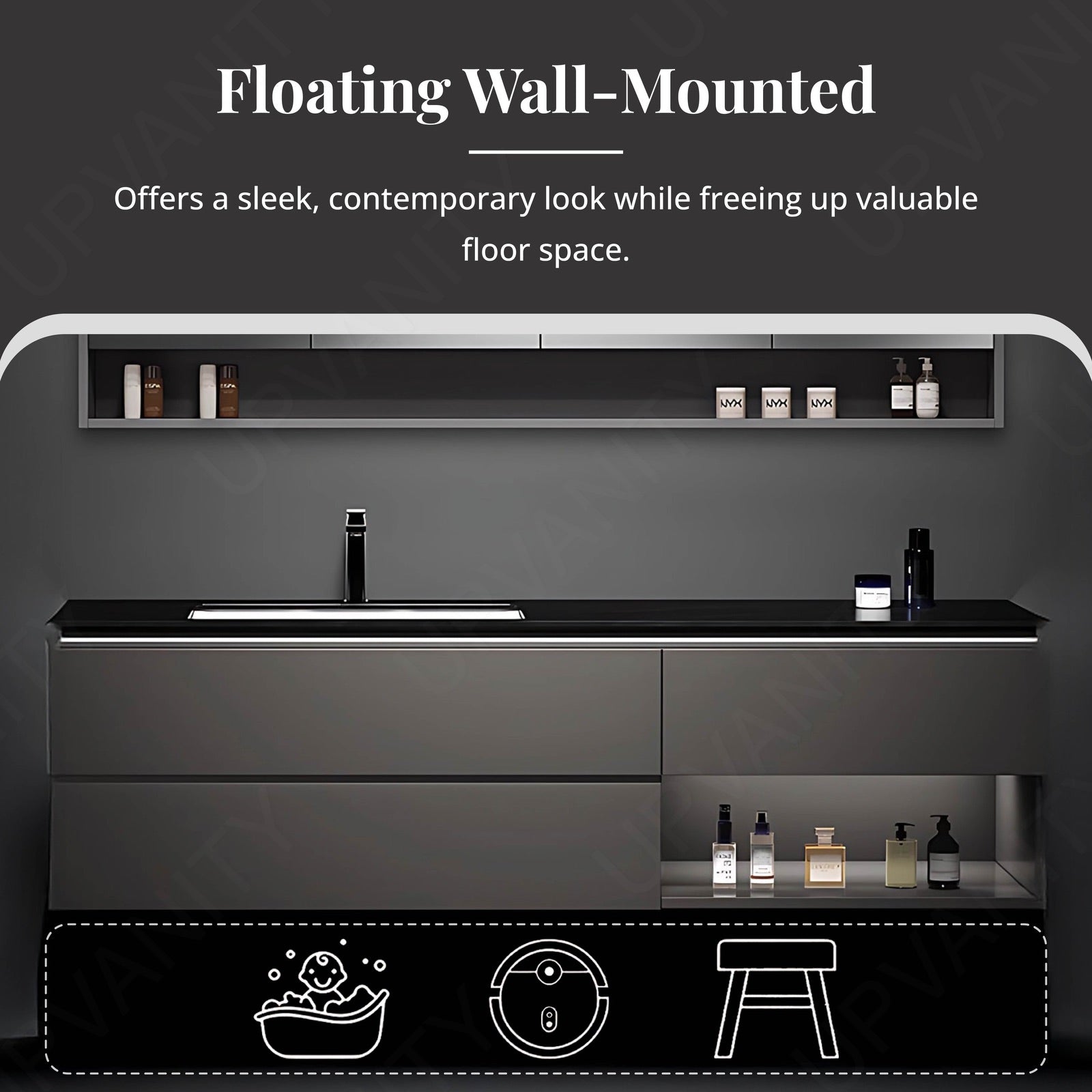 The floating design with open storage solutions maximizes space efficiency, offering a sleek look and practical storage for bathroom essentials.
