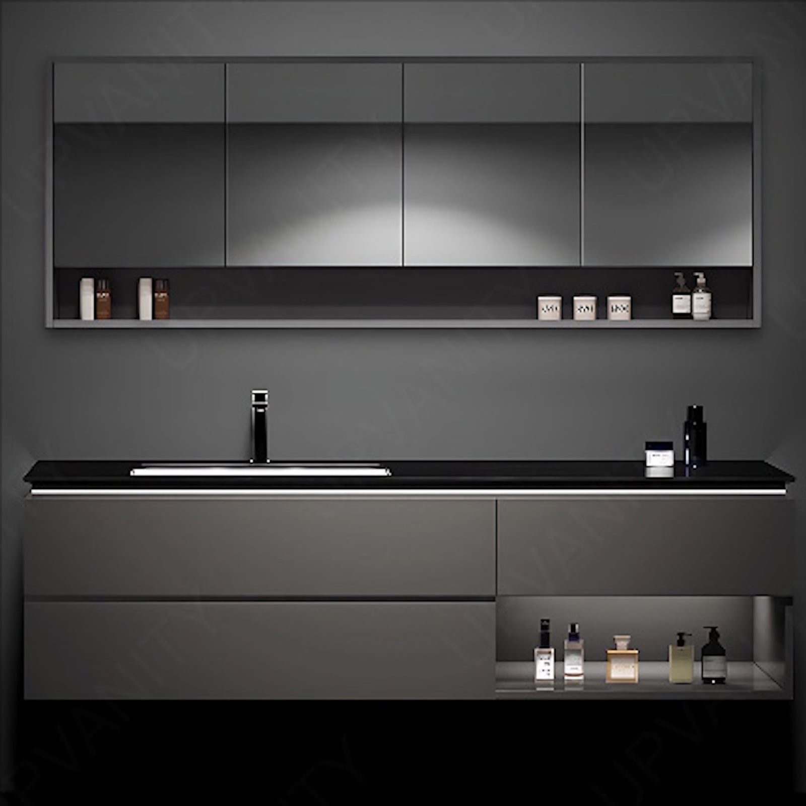 The black bath vanity set features a striking black slate top, offering a luxurious and contemporary look. Its open storage design enhances practicality while maintaining a sleek appearance. This single floating vanity is equipped with a smart LED mirror, providing modern functionality with defogging technology. The rear cabinet offers additional storage, making it an ideal choice for those seeking style and convenience in their bathroom space.