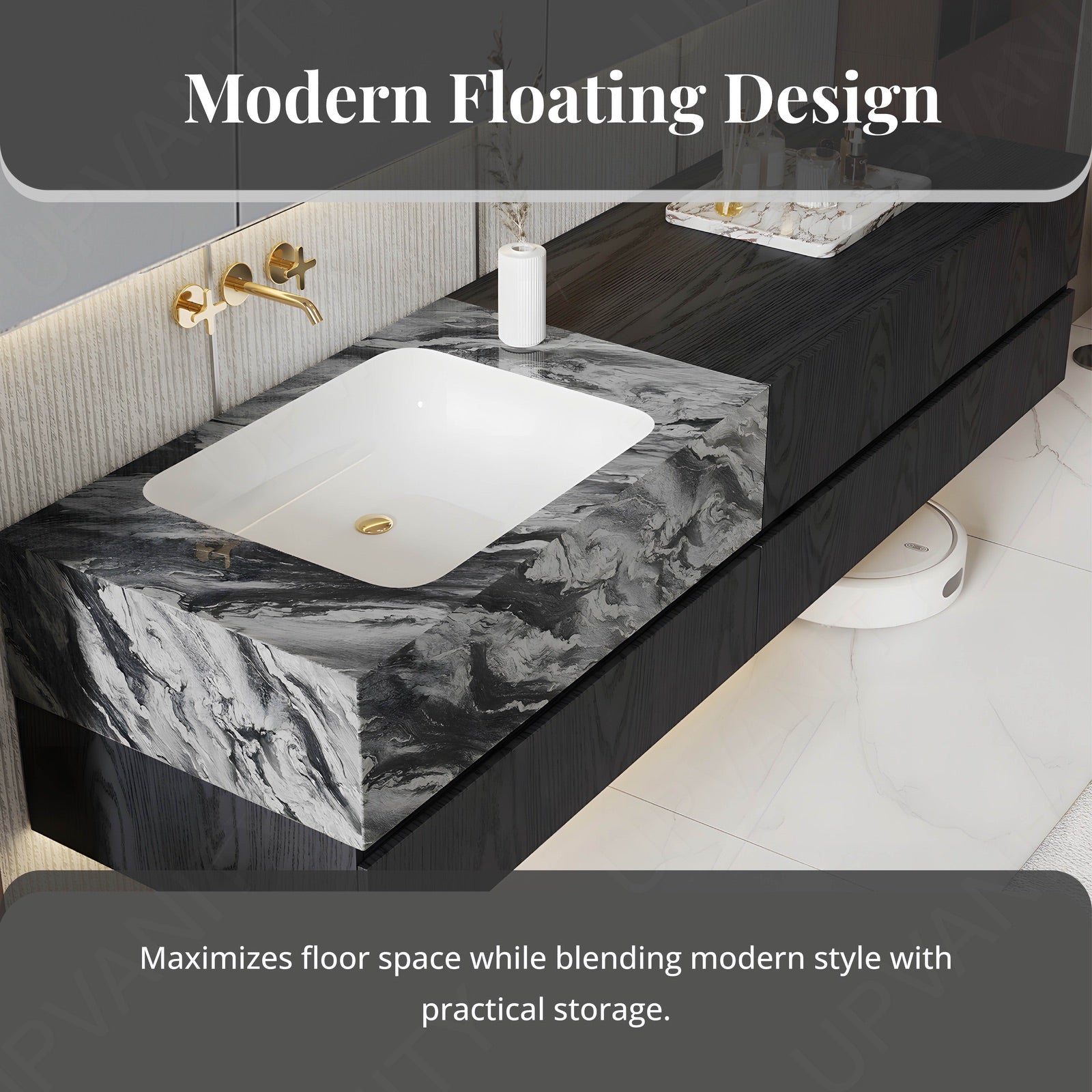 The marble‑textured top crowns this black floating single‑sink vanity with natural sophistication and visual depth. Its smooth stone pattern pairs with the bold cabinet tone to craft a high‑contrast, sculpted centerpiece. A smart LED mirror with defogging light elevates precision and ambiance, while the rear cabinet ensures discreet organization behind the mirror. Engineered from durable wood materials, it brings modern refinement and enduring strength to the bathroom space.