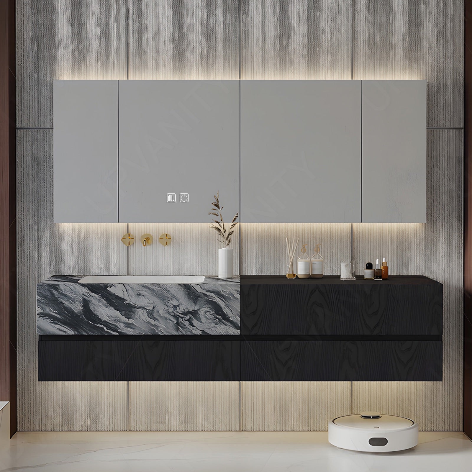 The rear cabinet expands vertical storage discreetly for toiletries and beauty essentials. It hides clutter while maintaining smooth lines and minimalist appearance across the mirror’s front.