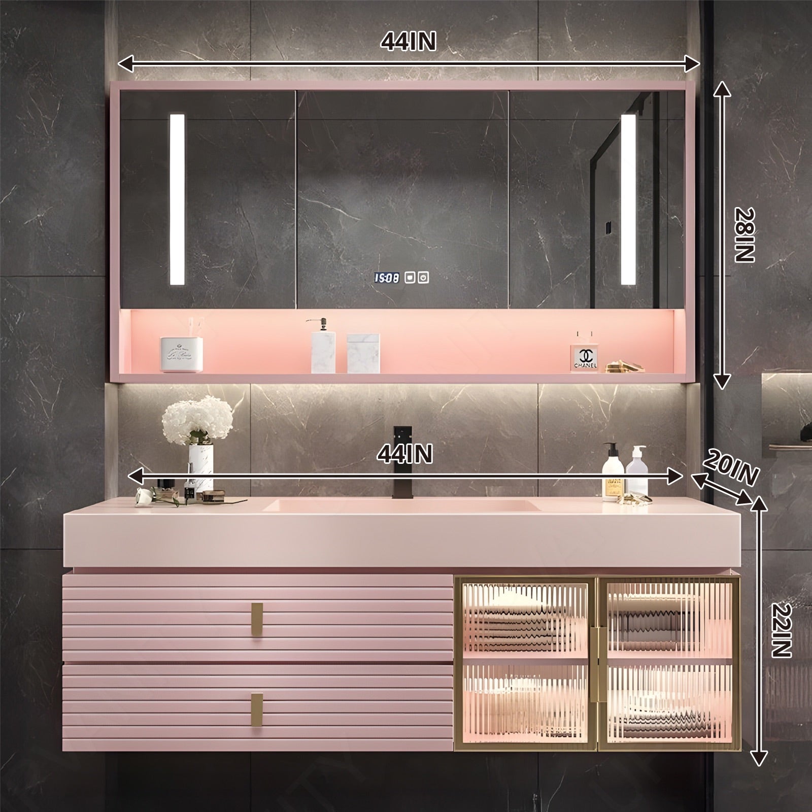 Introducing a touch of opulence to your bathroom with this Luxury Bath Vanity Set, showcasing elegant gold accents and a chic pink finish. Available in sizes ranging from 28" to 68", the vanity features a single sink, floating design, and is adorned with a glass door and striped panel for added sophistication. Equipped with a smart LED mirror, this set combines style with modern functionality, making it a standout addition to any bathroom.