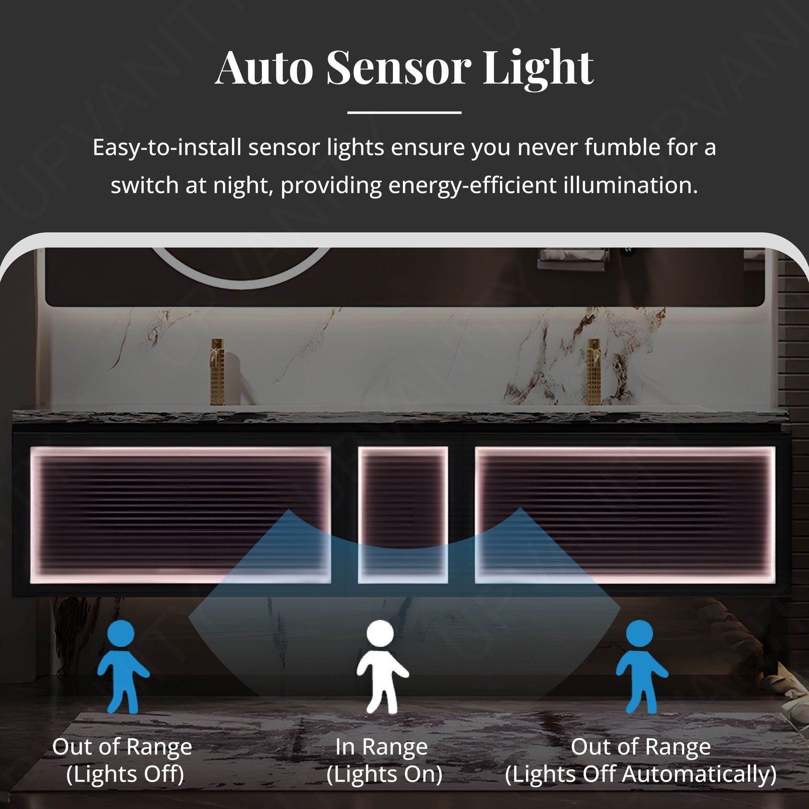 This vanity boasts a luxurious marble-textured top, combining timeless elegance with exceptional durability, perfect for the demands of daily use.