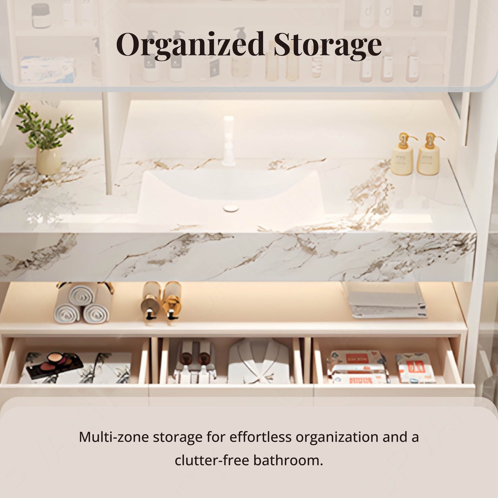 The beige split marble textured top of this modern bath vanity set introduces a touch of elegance and sophistication to any bathroom space. Its main hook is the smart LED mirror that provides enhanced lighting for a seamless grooming experience. Unique selling points include the floating design with an open storage concept, thanks to the split top, and a rear cabinet for additional storage. Crafted from premium materials, this vanity combines style with practicality.
