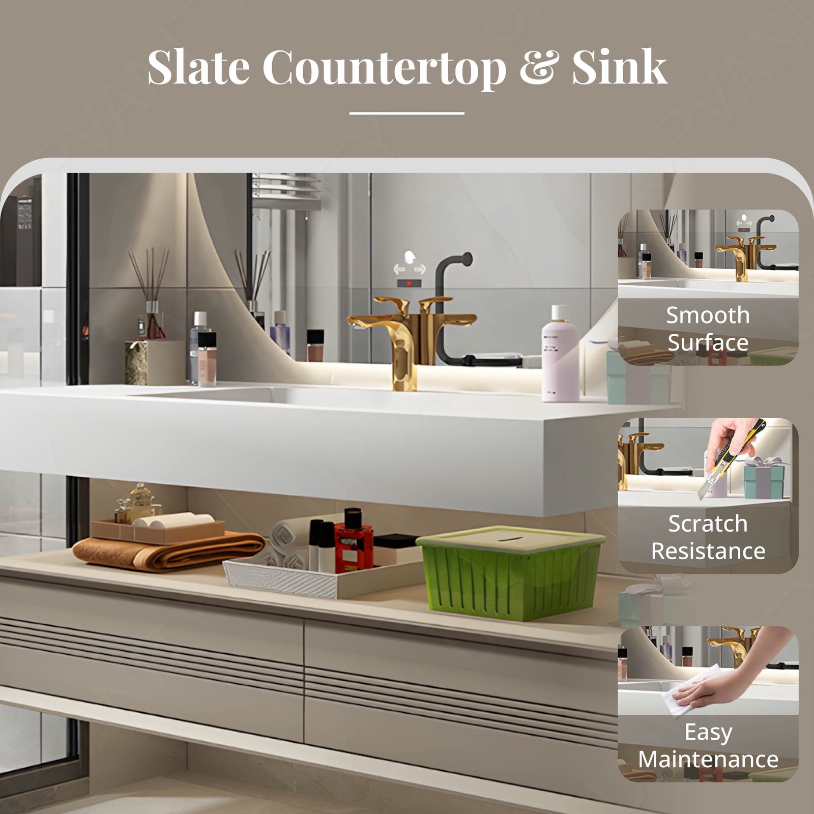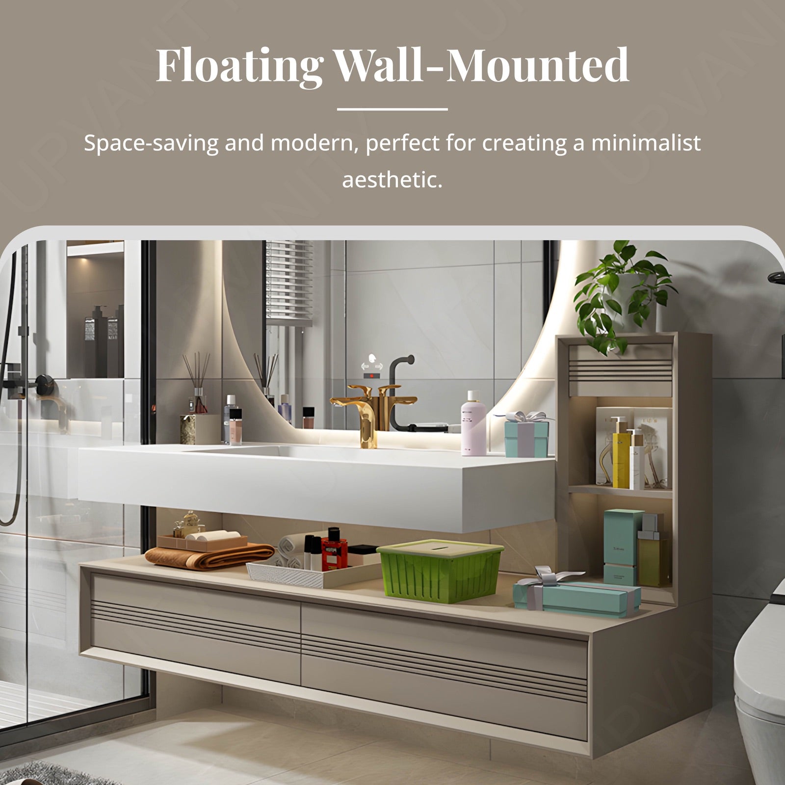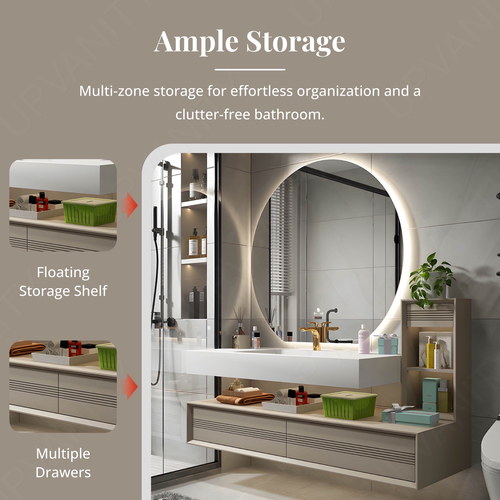 A striking blend of blue and beige cabinetry paired with a split white countertop defines this floating vanity, merging bold color contrast with functional open storage. The wall-mounted design maximizes floor space, while the split-top configuration integrates accessible shelving for daily essentials. A round smart LED mirror with anti-fog technology adds modern flair, and the adjustable 32"-72" width adapts to compact or spacious layouts. Crafted with moisture-resistant MDF and reinforced brackets, this set balances vibrant aesthetics with practicality, offering a fresh, storage-savvy upgrade for contemporary bathrooms.
