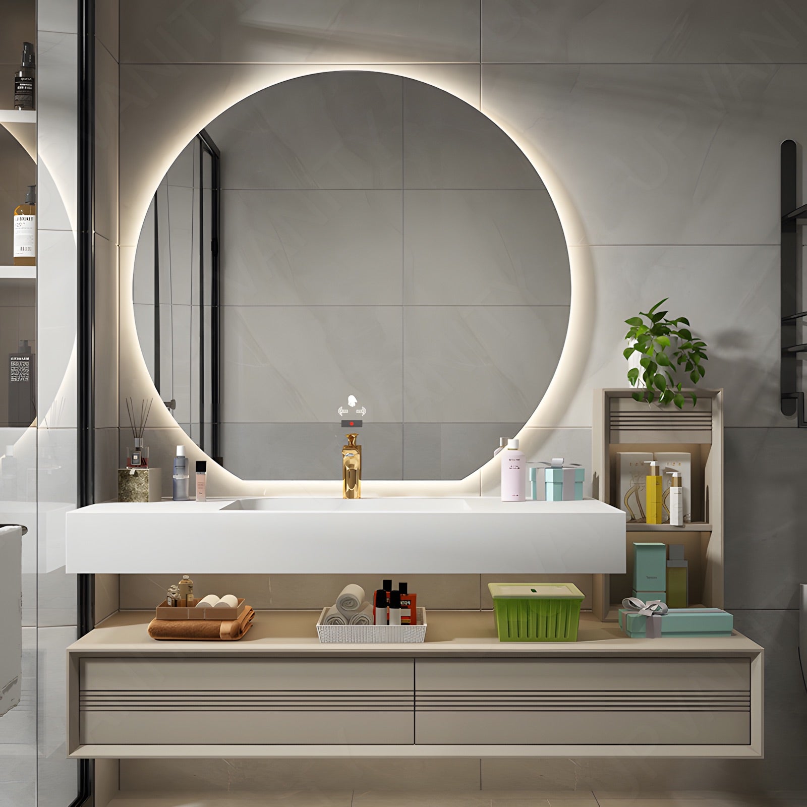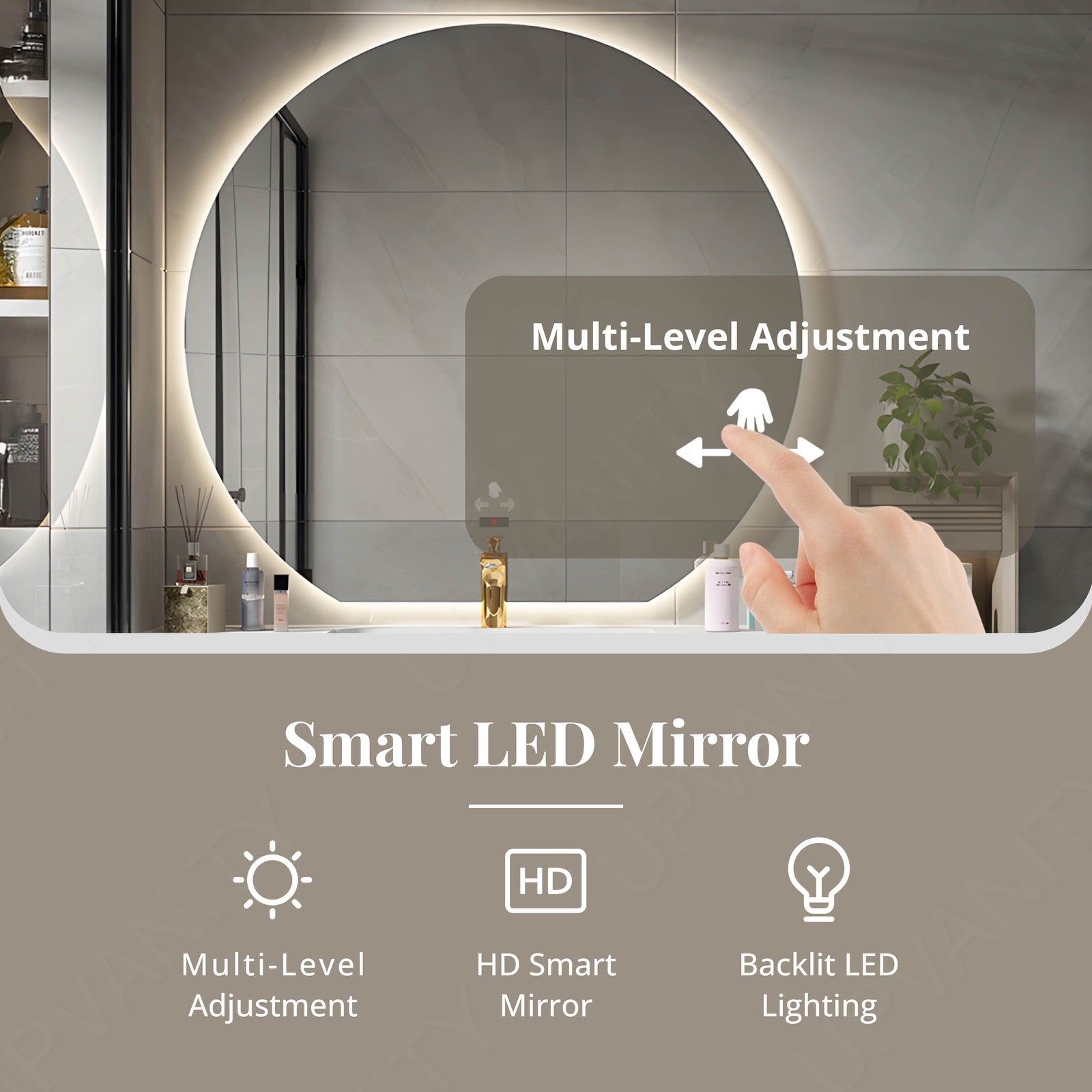Circular LED mirror with adjustable brightness and defogging ensures clarity in humid environments.