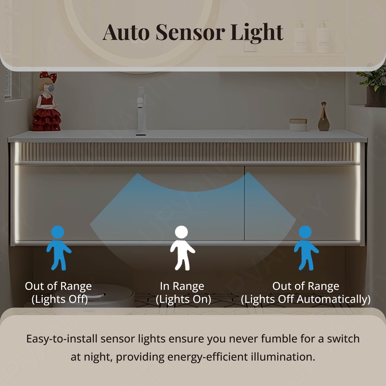 Built-in LED strips offer hands-free, soft ambient light around the cabinet edges, ideal for nighttime use and enhancing the overall modern aesthetic.