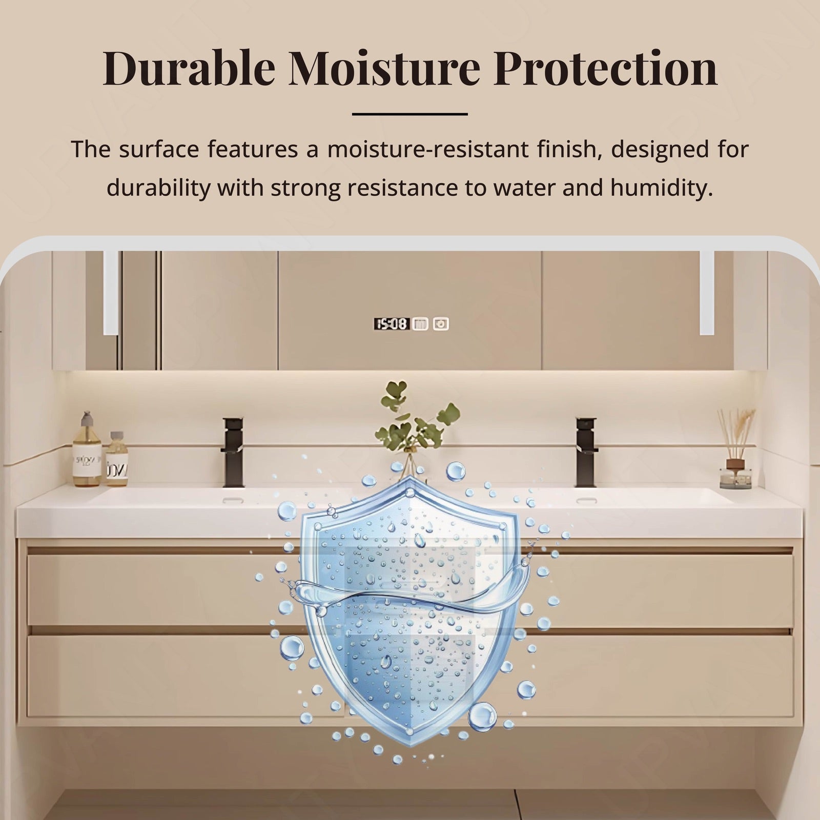 A rear cabinet behind the mirror offers additional concealed storage for toiletries and essentials, maintaining an uncluttered countertop and bathroom space.