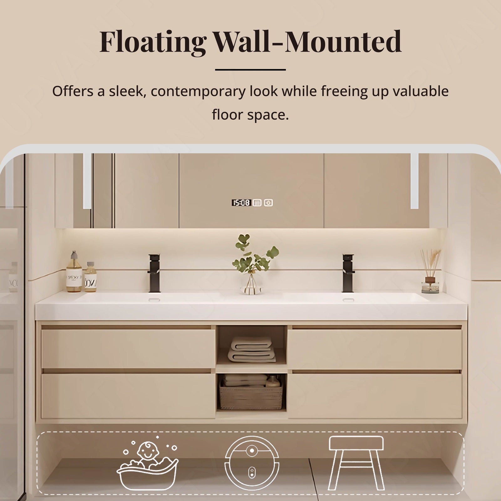 The beige modern bath vanity set boasts an open storage design, offering stylish accessibility alongside substantial organization. Featuring a sleek white slate countertop and double sinks, this floating vanity maximizes space and convenience while maintaining a contemporary aesthetic. The smart LED mirror enhances your daily routine with built-in defogging and ambient lighting, complemented by a rear cabinet ideal for additional storage. Crafted with premium materials, this set perfectly balances form and function in any bathroom.