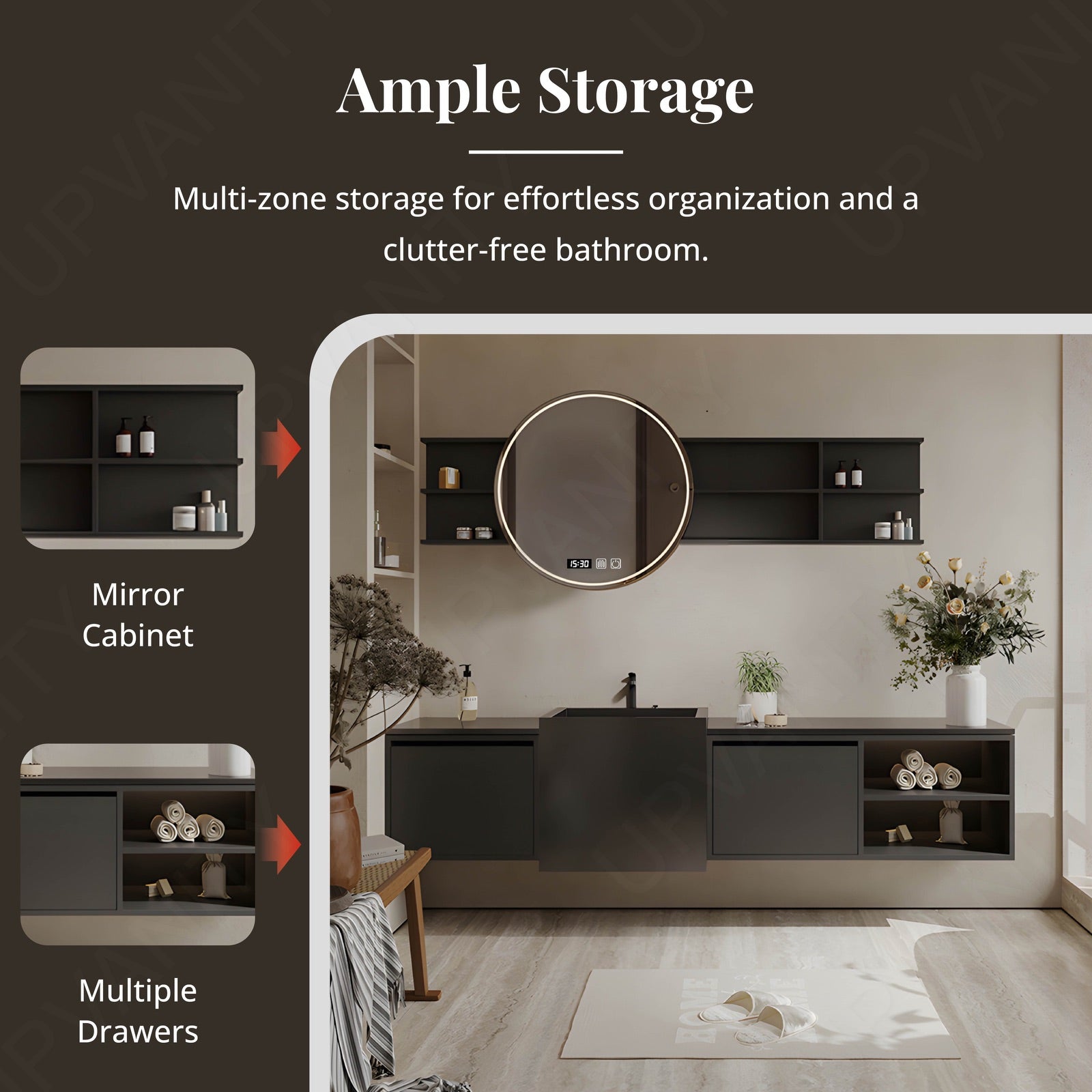 The black column design anchors this floating vanity with a symmetrical, architectural flair that commands attention. Its matte black form contrasts beautifully with the bright countertop, while open storage ensures accessible organization. A single integrated sink delivers modern simplicity and easy cleaning. The smart LED mirror and side cabinet complete the set, combining lighting innovation with practical storage. Crafted with durable materials, this vanity brings refined sophistication and balance to your bathroom design.