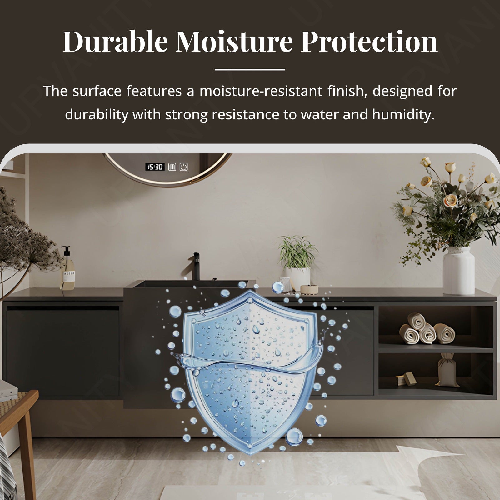 Crafted from high‑quality, water‑resistant material, the countertop resists wear from daily use. Its smooth, polished sheen complements the vanity’s dark tone and architectural form.