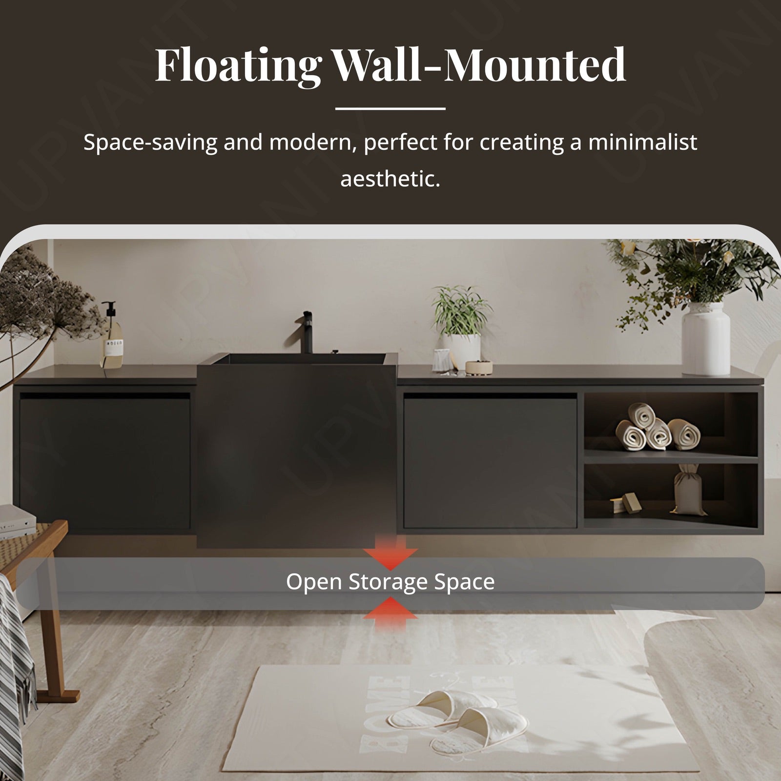 Wall‑mounted design frees the floor area, adding openness and seamless flow to the room. Beneath, the open storage shelf offers convenient access to daily essentials while keeping the modern aesthetic clean.