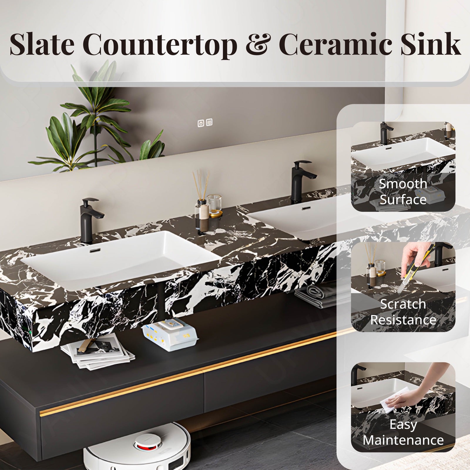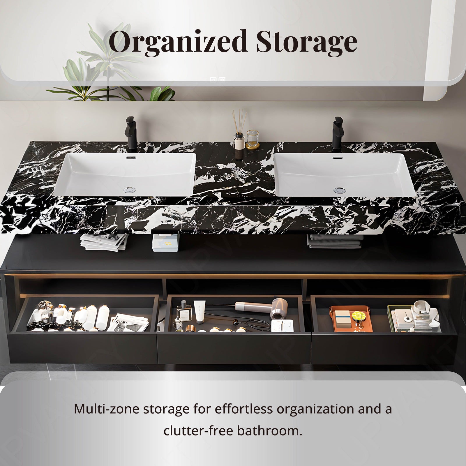 This modern bath vanity set features a sleek black finish with a black marble-textured top, creating a bold statement in your bathroom. The main hook is its floating design, which includes an open storage concept for easy access and organization. The double sink setup is perfect for shared spaces, while the smart LED mirror enhances your daily routine with optimal lighting and defogging technology. Crafted with premium materials, this vanity combines modern aesthetics with practical functionality.