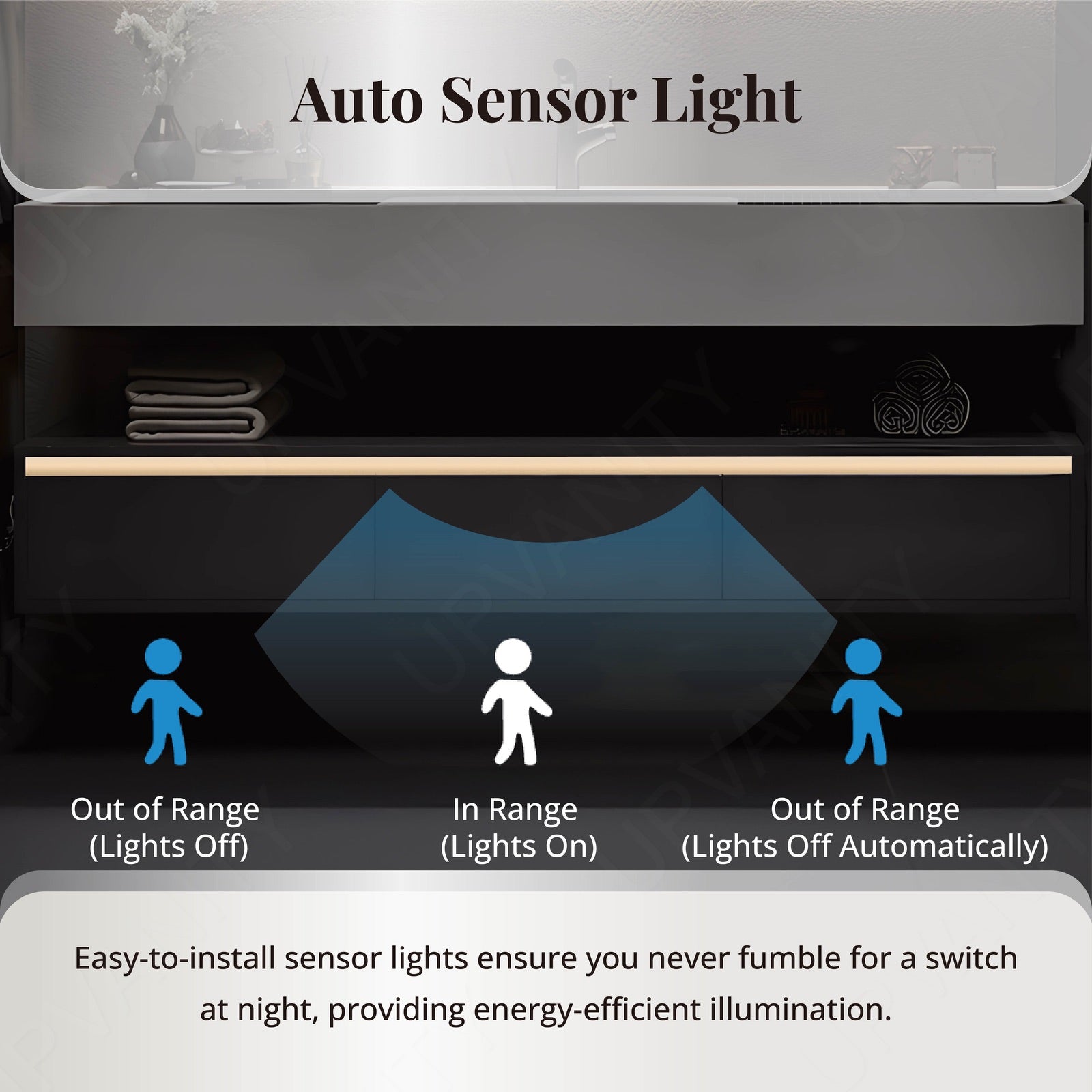 Equipped with a smart LED mirror, this vanity set integrates advanced lighting solutions for enhanced visibility and convenience. The mirror's defogging feature ensures clarity, while energy-efficient LEDs offer ambient lighting for daily routines.