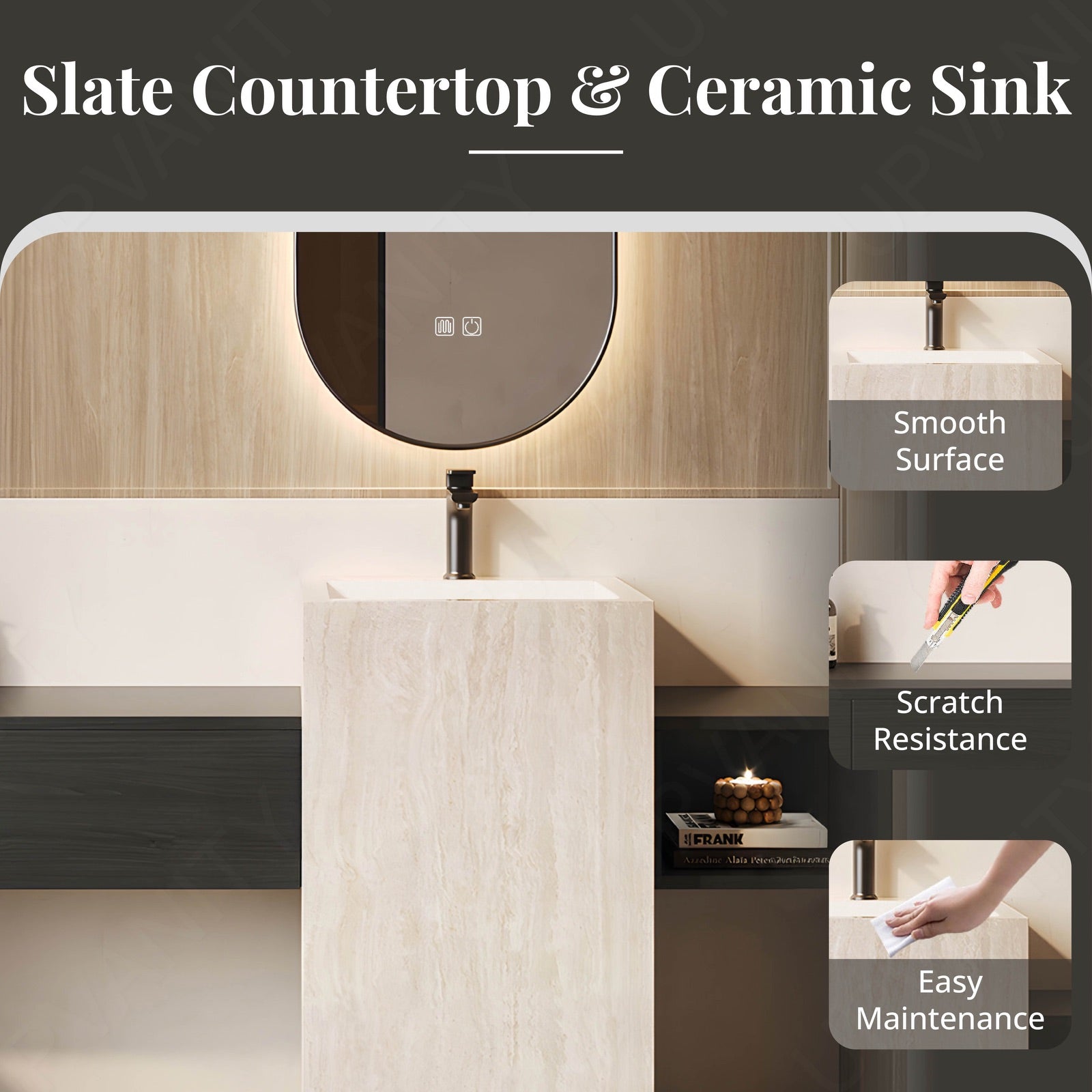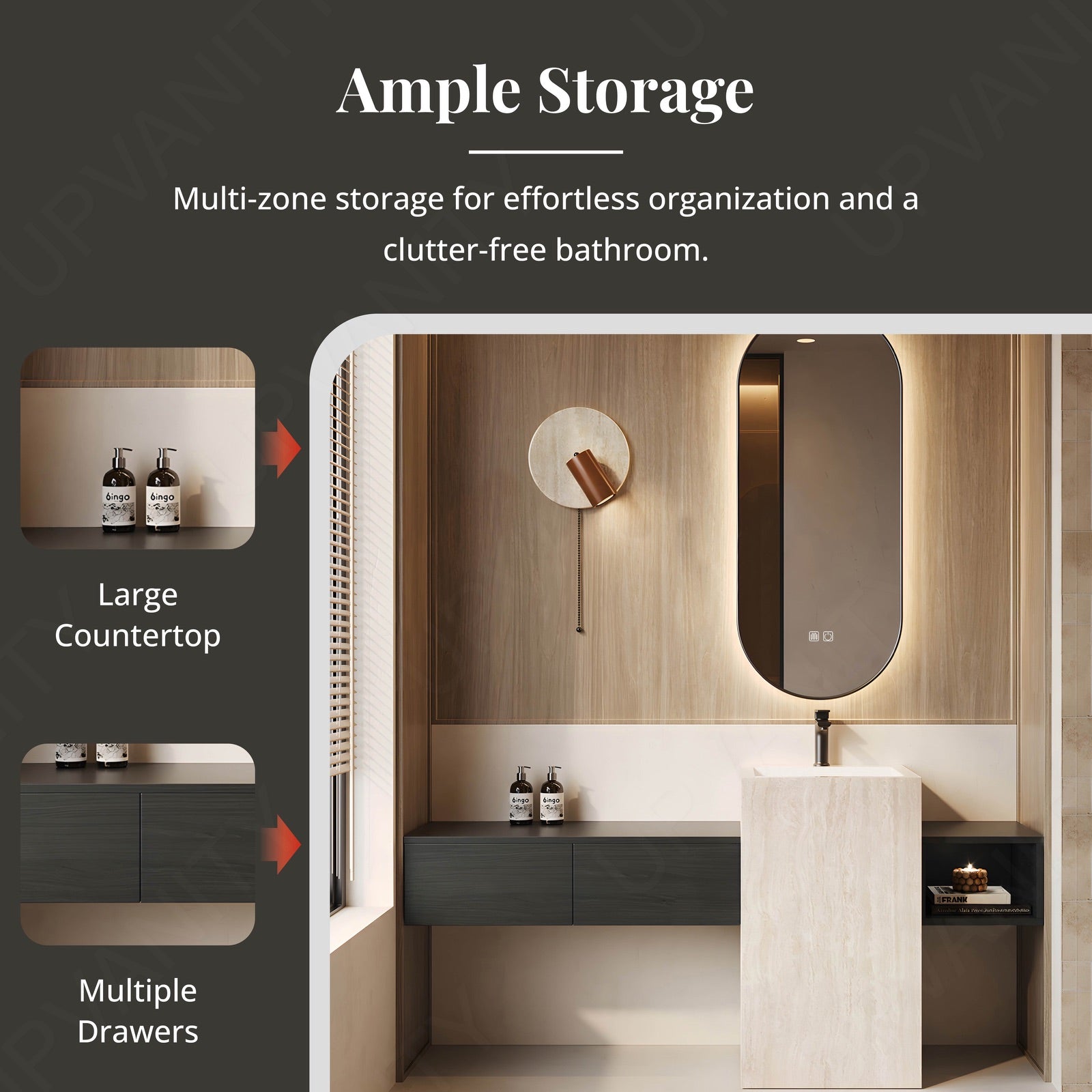 The white column design gives this black freestanding vanity a striking architectural rhythm, enhanced by open storage that adds depth and convenience. The bold contrast between white columns and dark finish defines a modern, balanced aesthetic. Its oval smart LED mirror delivers continuous, glare‑free illumination with a defogging function for clear reflection. Crafted with durable materials and a single integrated sink, this design merges elegance, precision, and practical daily functionality.