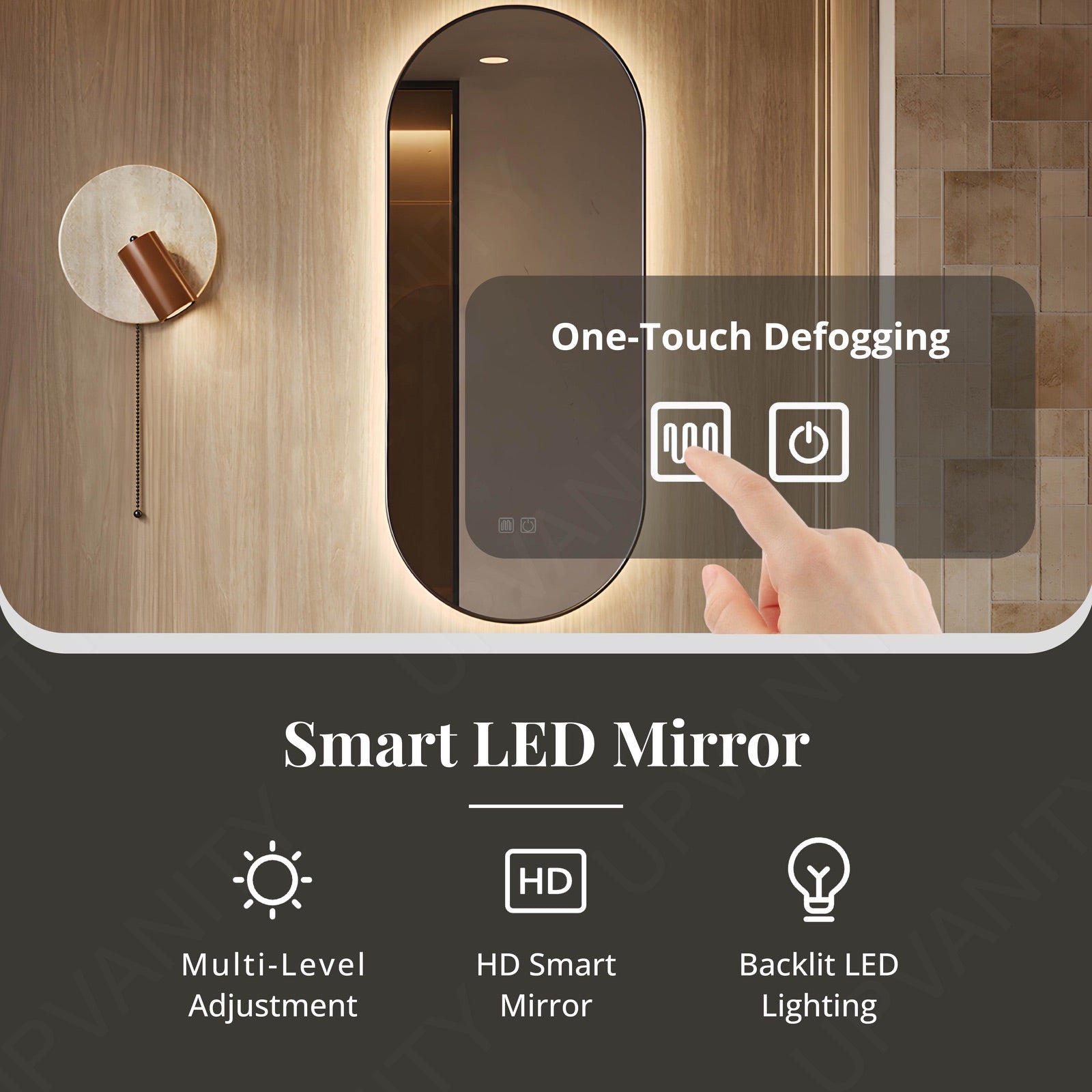 The oval mirror delivers even, natural LED light ideal for grooming. Defogging capability ensures clarity after showers, combining beauty, modern utility, and energy‑smart illumination.