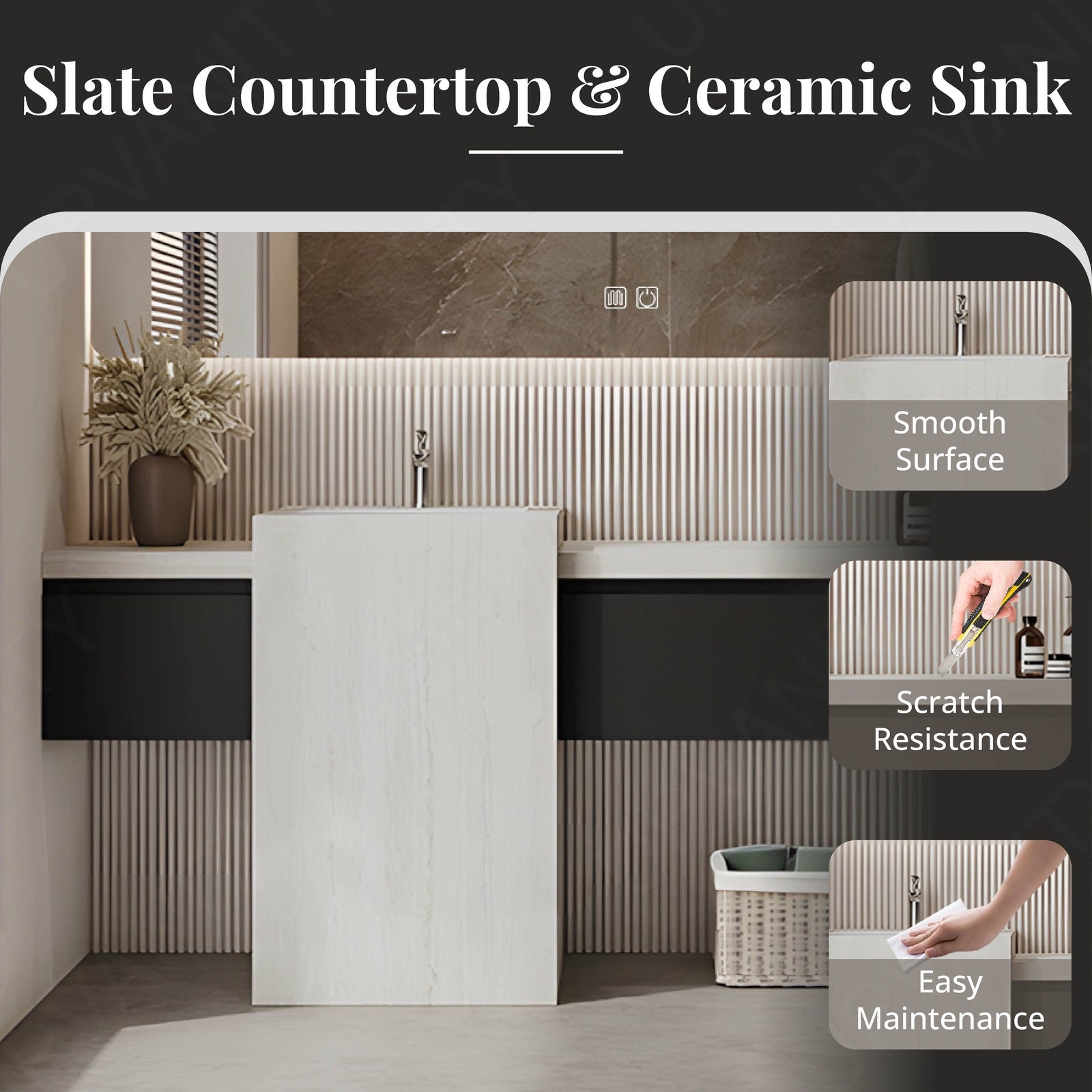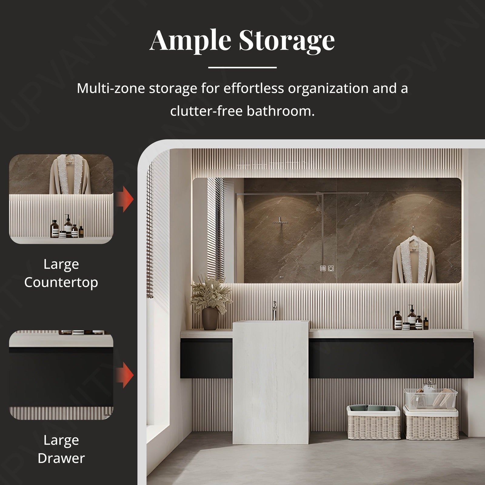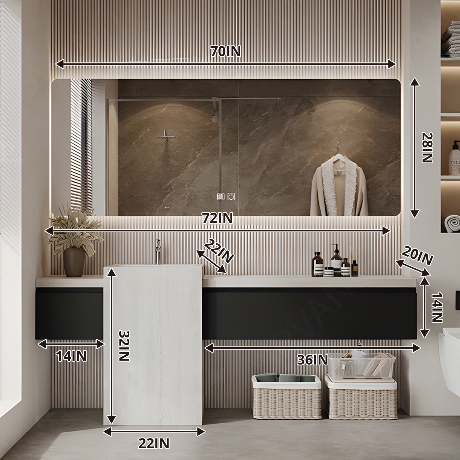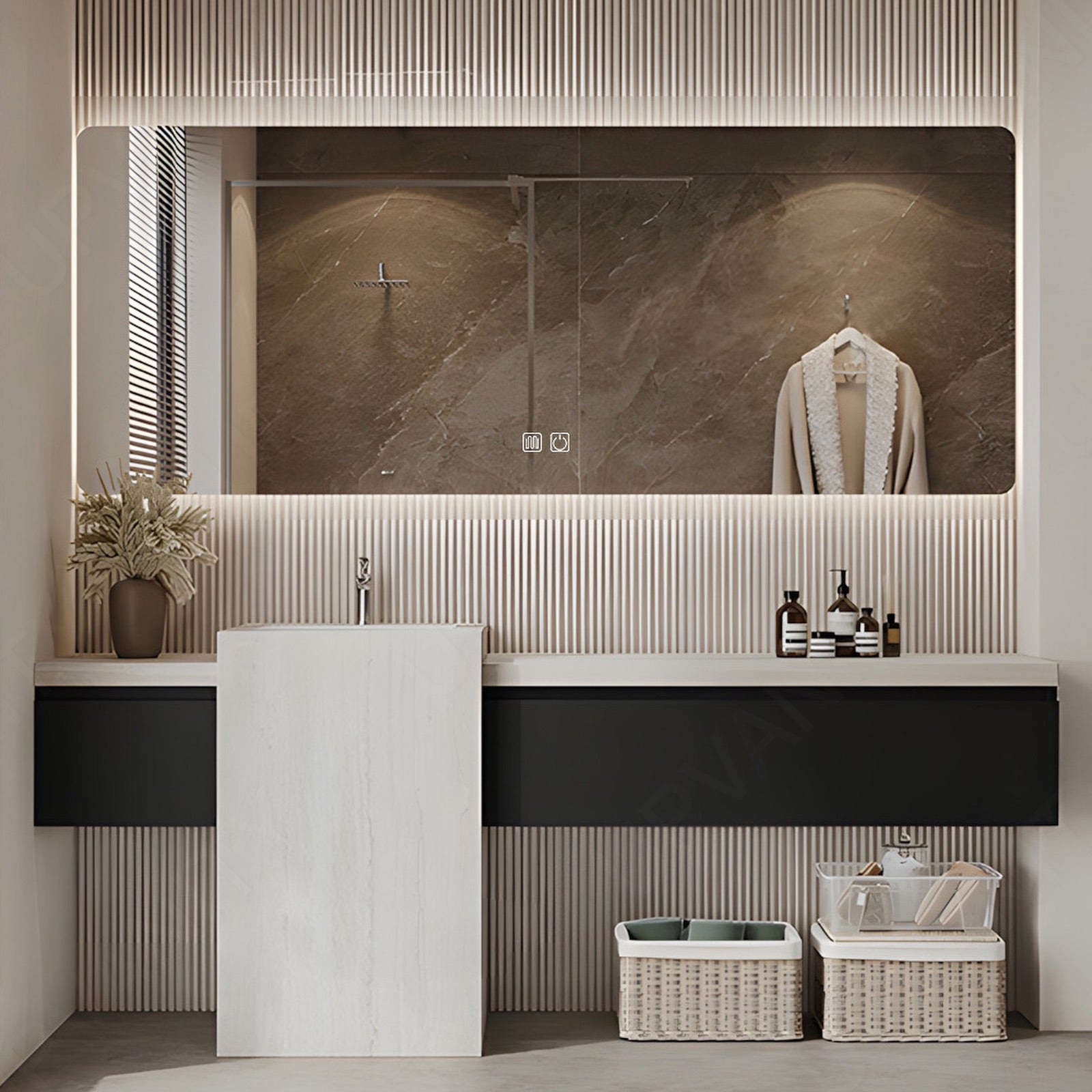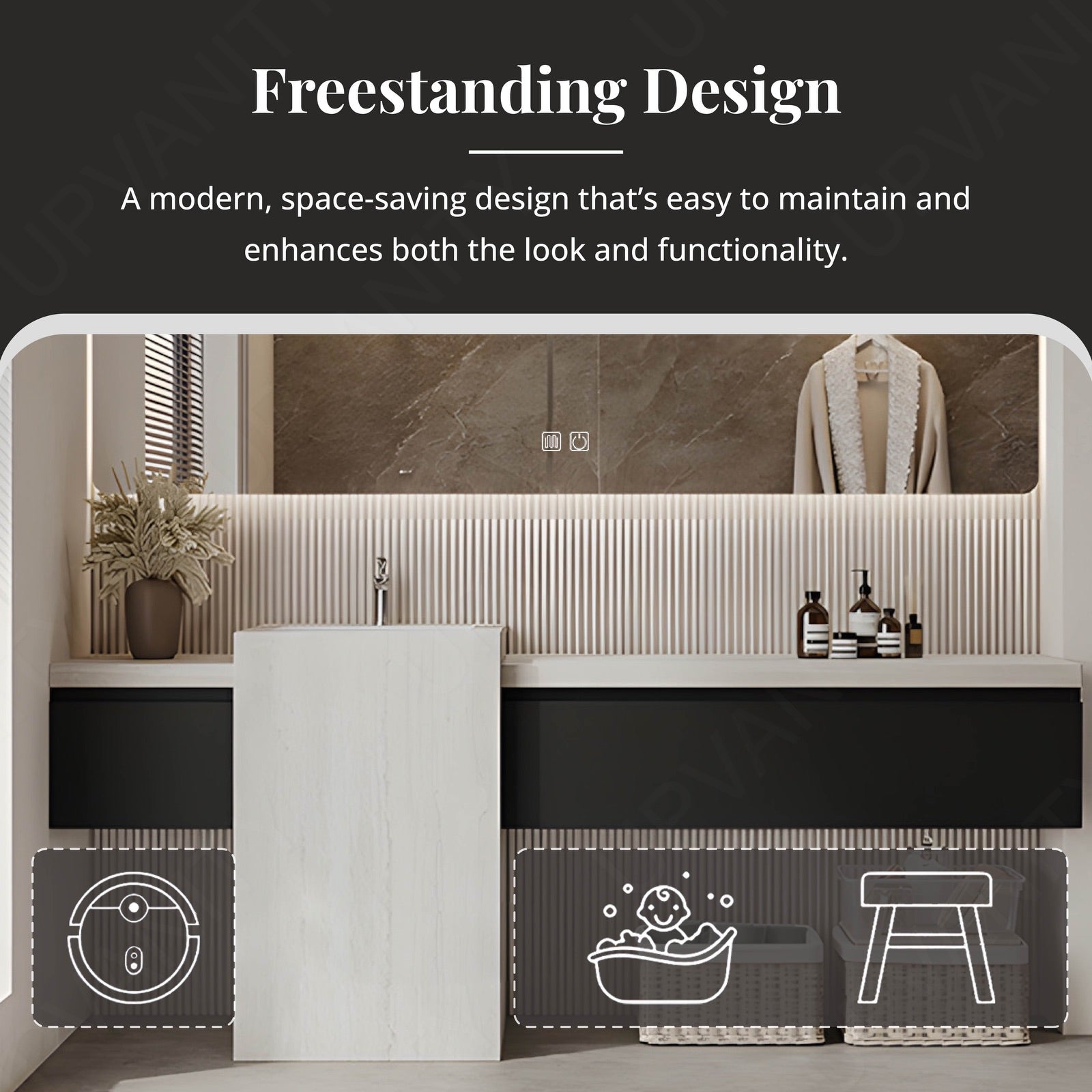 The white column design defines this black freestanding vanity, creating bold vertical contrast and refined geometry. Its structural column detail frames the cabinet with stability and visual rhythm, while the smooth black finish grounds it in modern elegance. A single integrated sink streamlines daily routines with premium practicality, complemented by a smart LED mirror that delivers crisp light and defogging clarity. Durable materials, balanced form, and versatile scale complete the contemporary centerpiece.