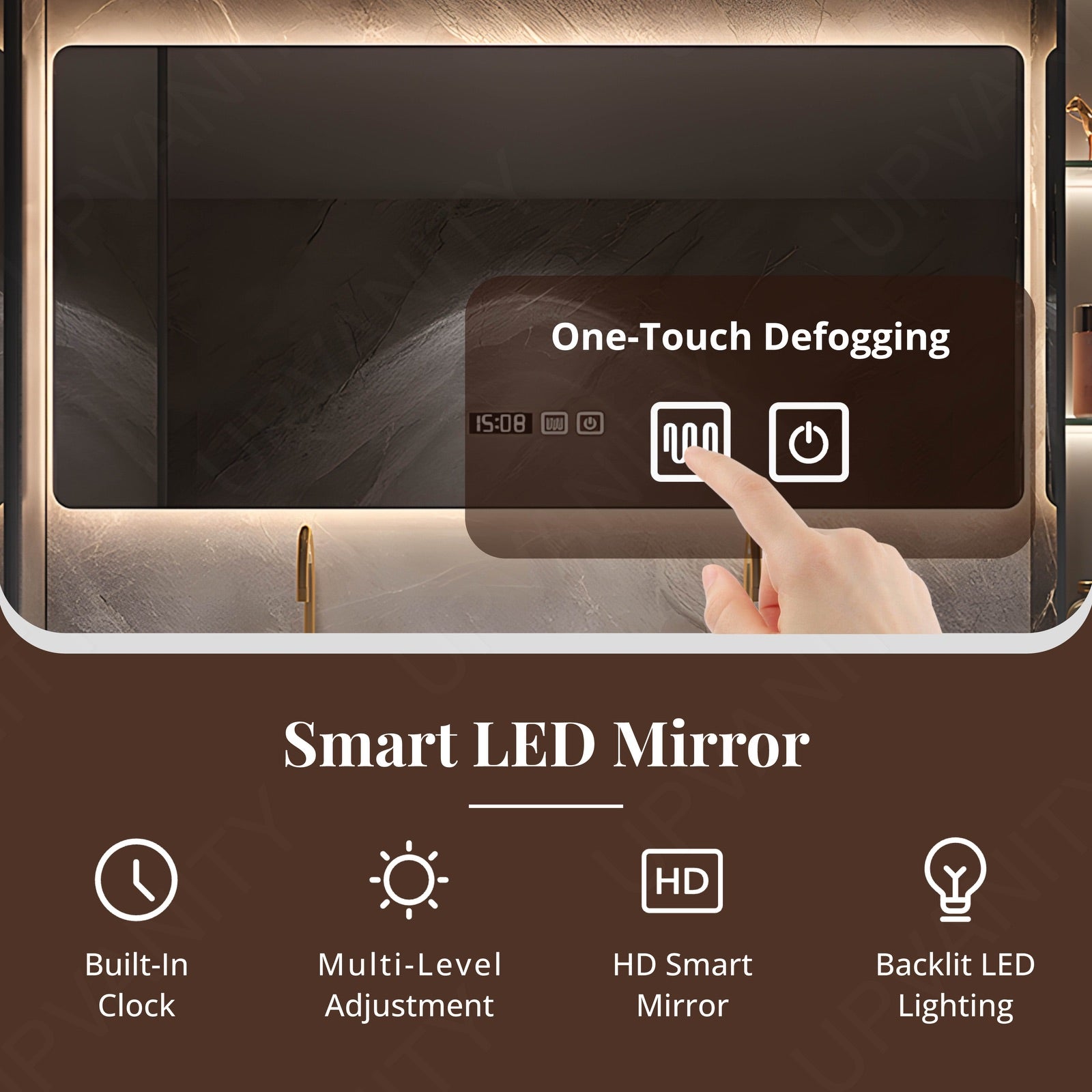 Equipped with a smart LED mirror, this vanity set offers bright, energy-efficient lighting with defogging technology, ensuring clarity and convenience in your daily routine.