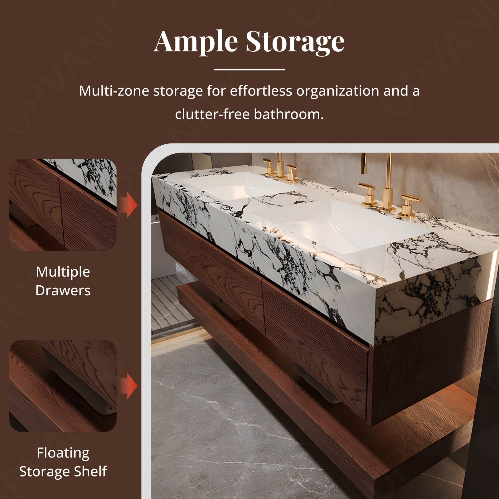 The joint marble-textured top of this brown modern bath vanity set introduces a sophisticated touch, blending elegance with practicality. Its main hook is the smart LED mirror that offers optimal lighting for grooming. Unique selling points include the floating design with open storage, maximizing space and organization, and double sinks for efficient shared use. Crafted with high-quality materials, it embodies both style and functionality, enhancing your bathroom's aesthetic.