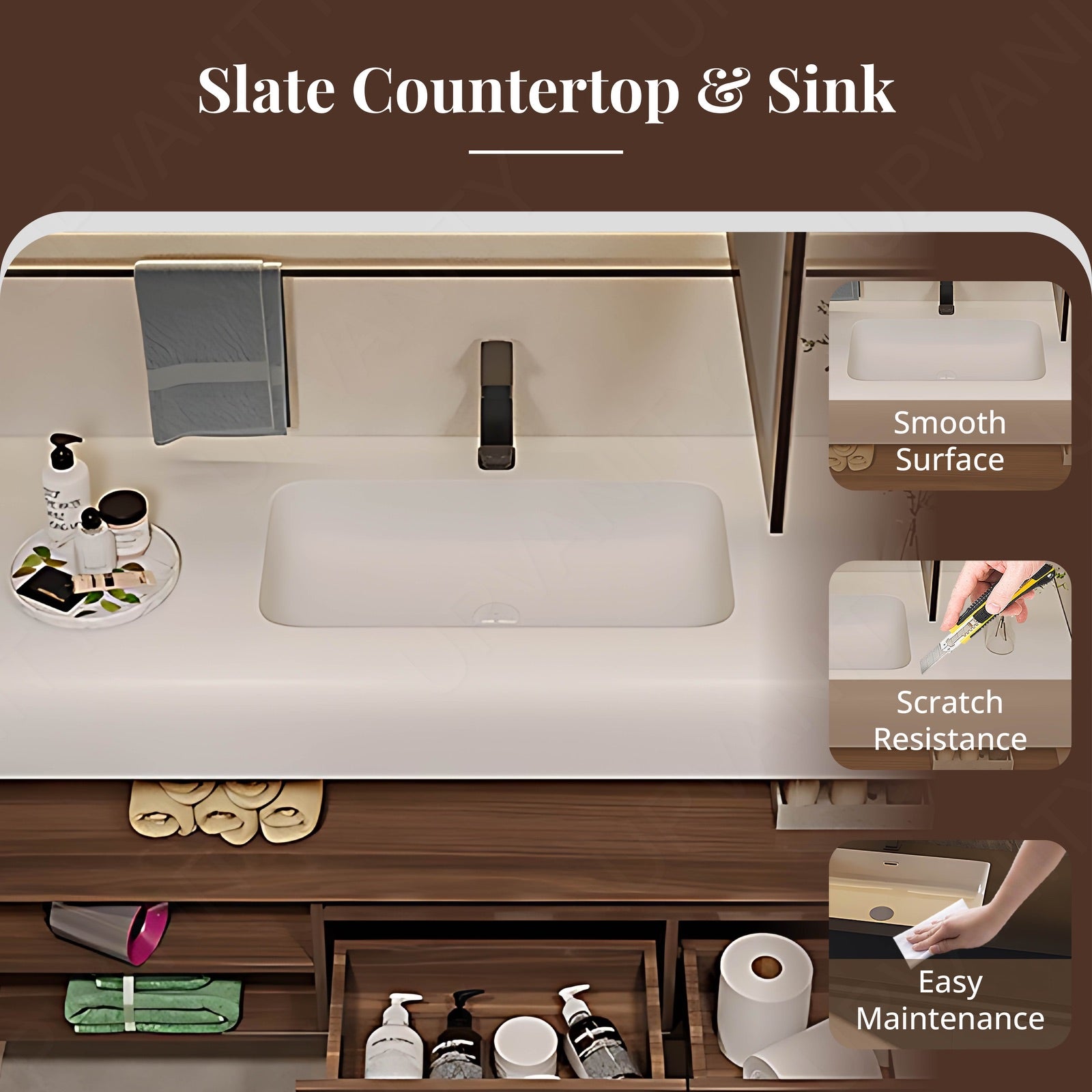 The brown vanity with a split white top and floating design offers a sleek and functional centerpiece for modern bathrooms. Its smart LED mirror and rear cabinet provide advanced storage and lighting solutions for everyday use. The open storage layout enhances accessibility while maintaining a clean, minimalist look. Designed with a durable integrated sink and smooth finishes, this vanity set blends practicality and style.