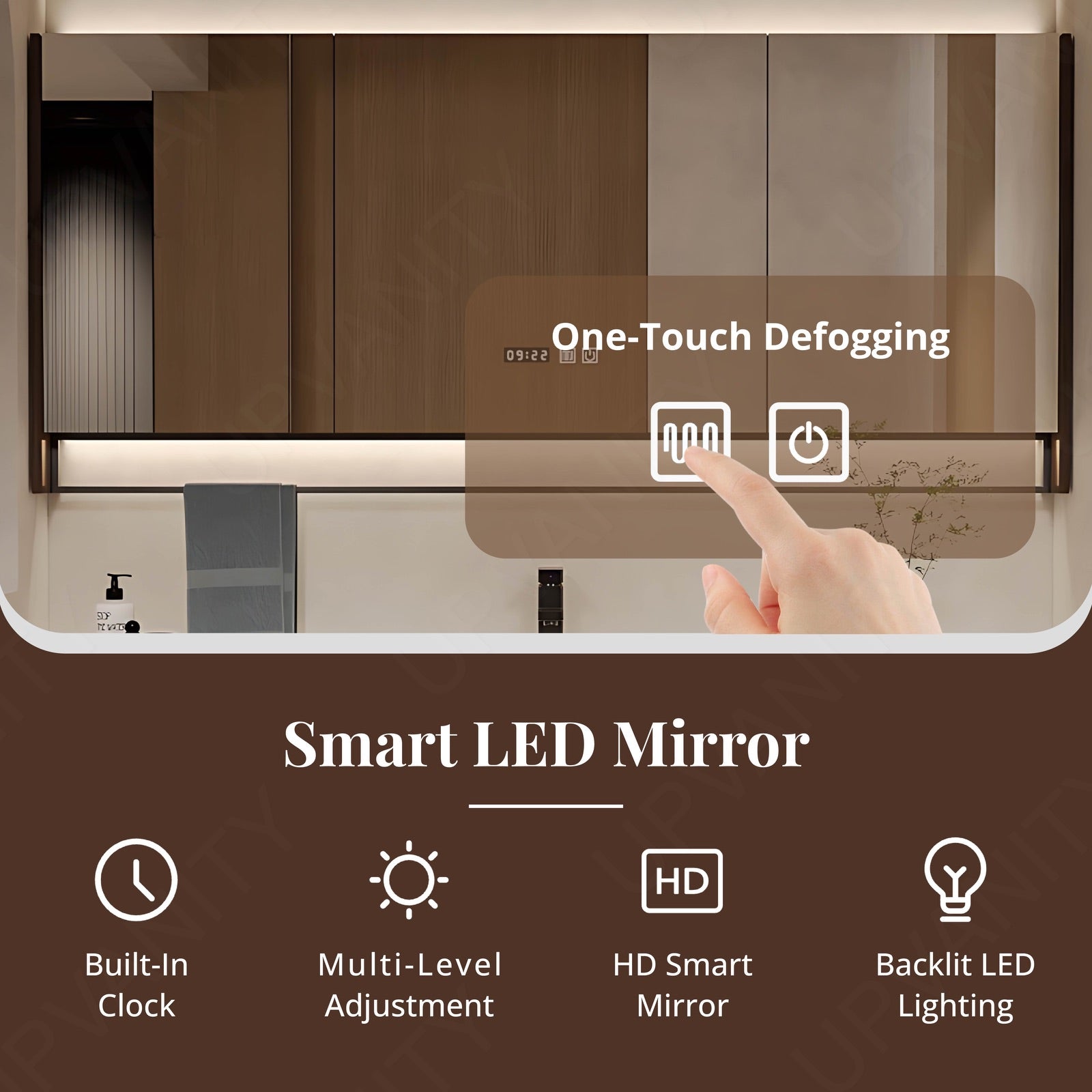 The smart LED mirror provides customizable ambient lighting and defogging technology, ensuring a clear reflection and an illuminated space for your grooming routine.