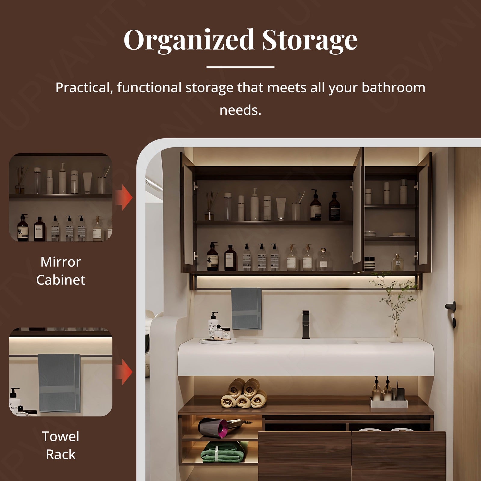 The rear cabinet around the mirror adds hidden storage compartments, ideal for organizing toiletries and daily-use items, ensuring a clutter-free and polished look.