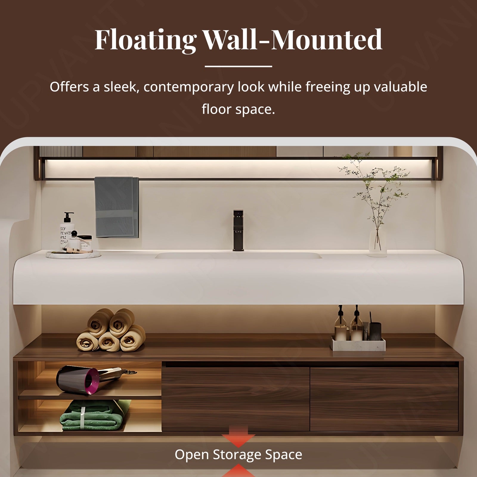 The floating design features an open storage layout, offering easy access to frequently used items while saving floor space and enhancing your bathroom’s modern appeal.