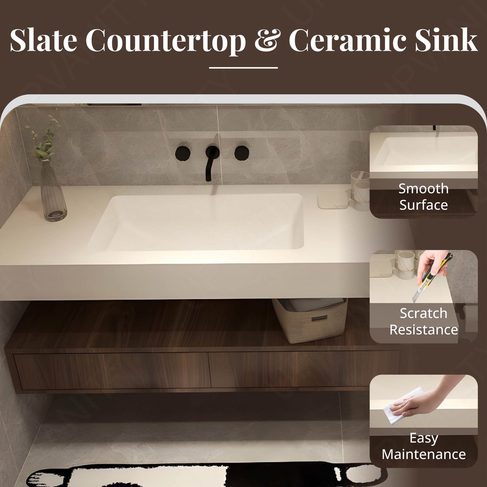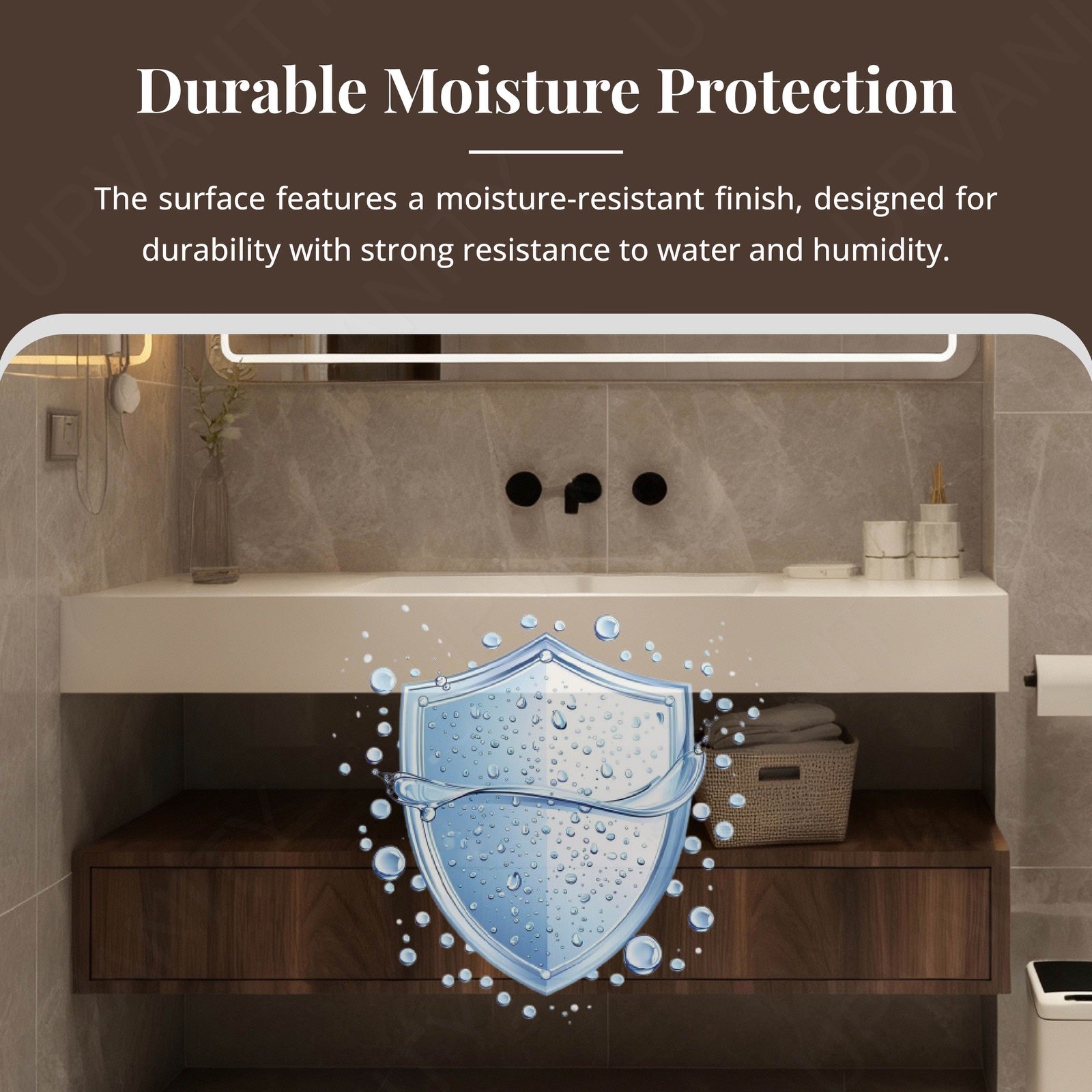 Crafted to withstand humidity and constant use, the countertop delivers lasting resilience without sacrificing beauty. Its smooth edges and crisp lines bring harmony to the vanity’s refined form.