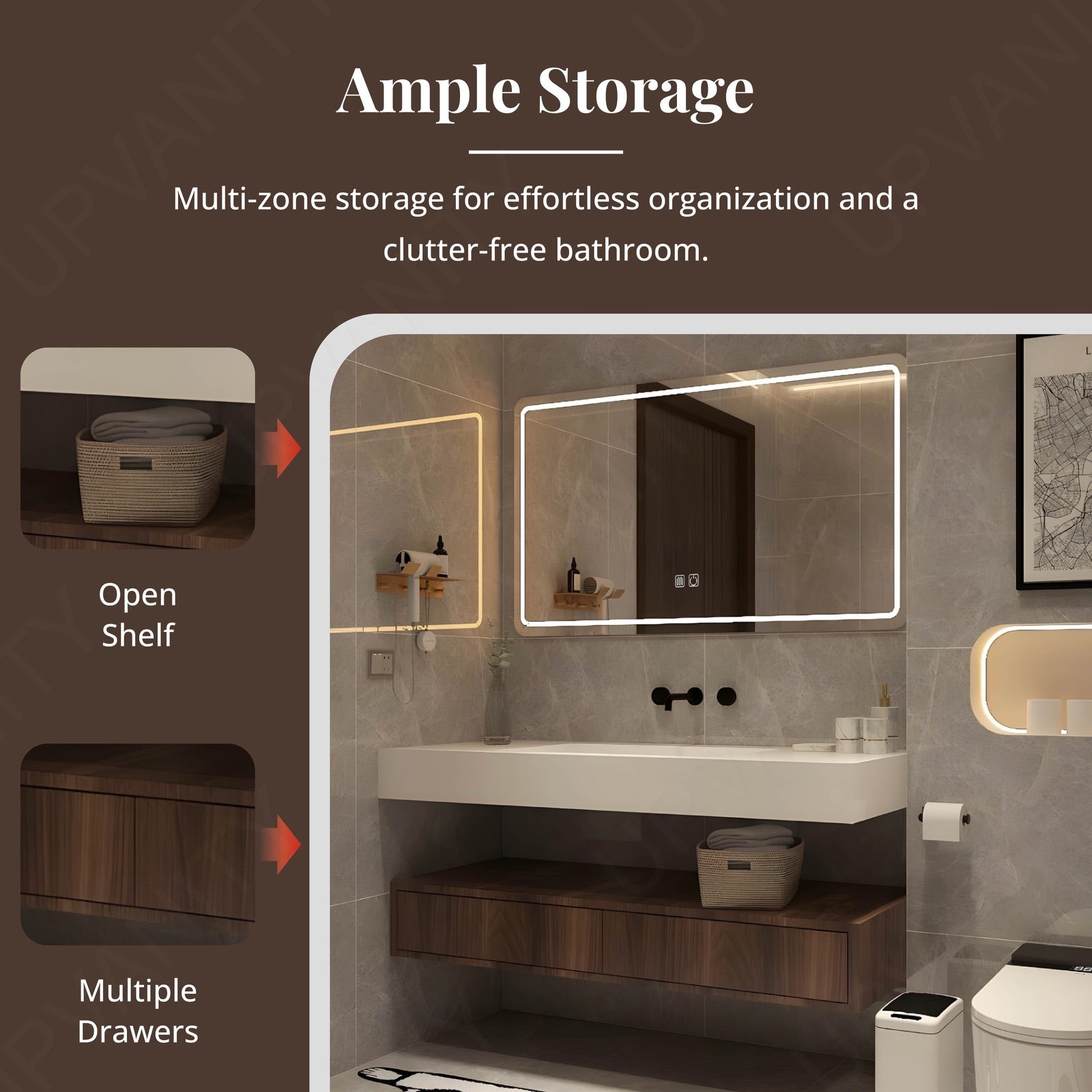 The split white top design gives this rich brown floating vanity a light, graceful contrast, underscoring its open-storage structure and balanced proportions. Designed for modern simplicity, it features a single integrated sink and smooth countertop ideal for compact or mid-sized spaces. The smart LED mirror brightens daily routines with steady illumination, completing a clean, spacious aesthetic anchored by durability and timeless beauty.