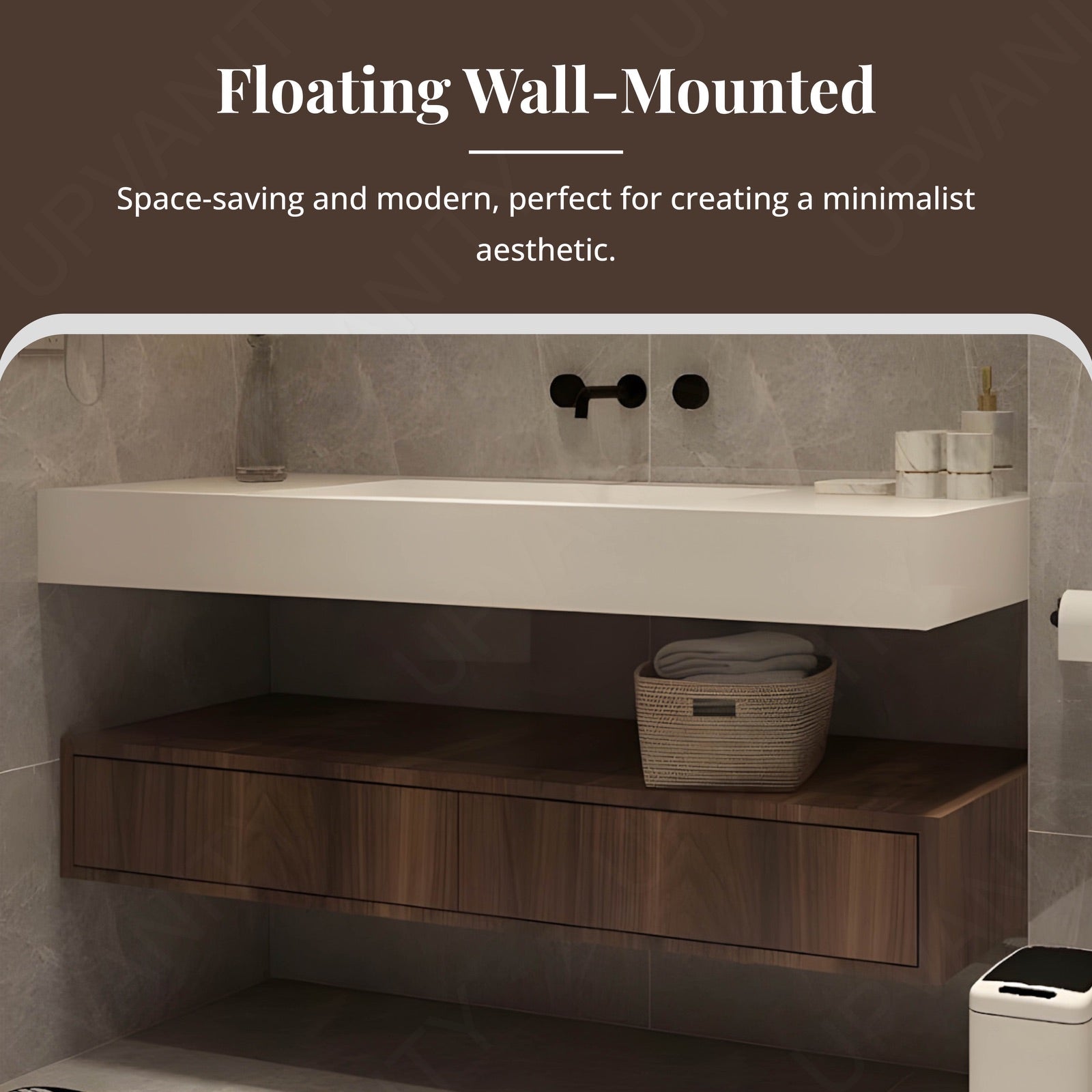 A floating construction creates a sleek, weightless profile while freeing floor space. The open under-shelf adds both style and functionality, offering easy access to towels or daily-use accessories.