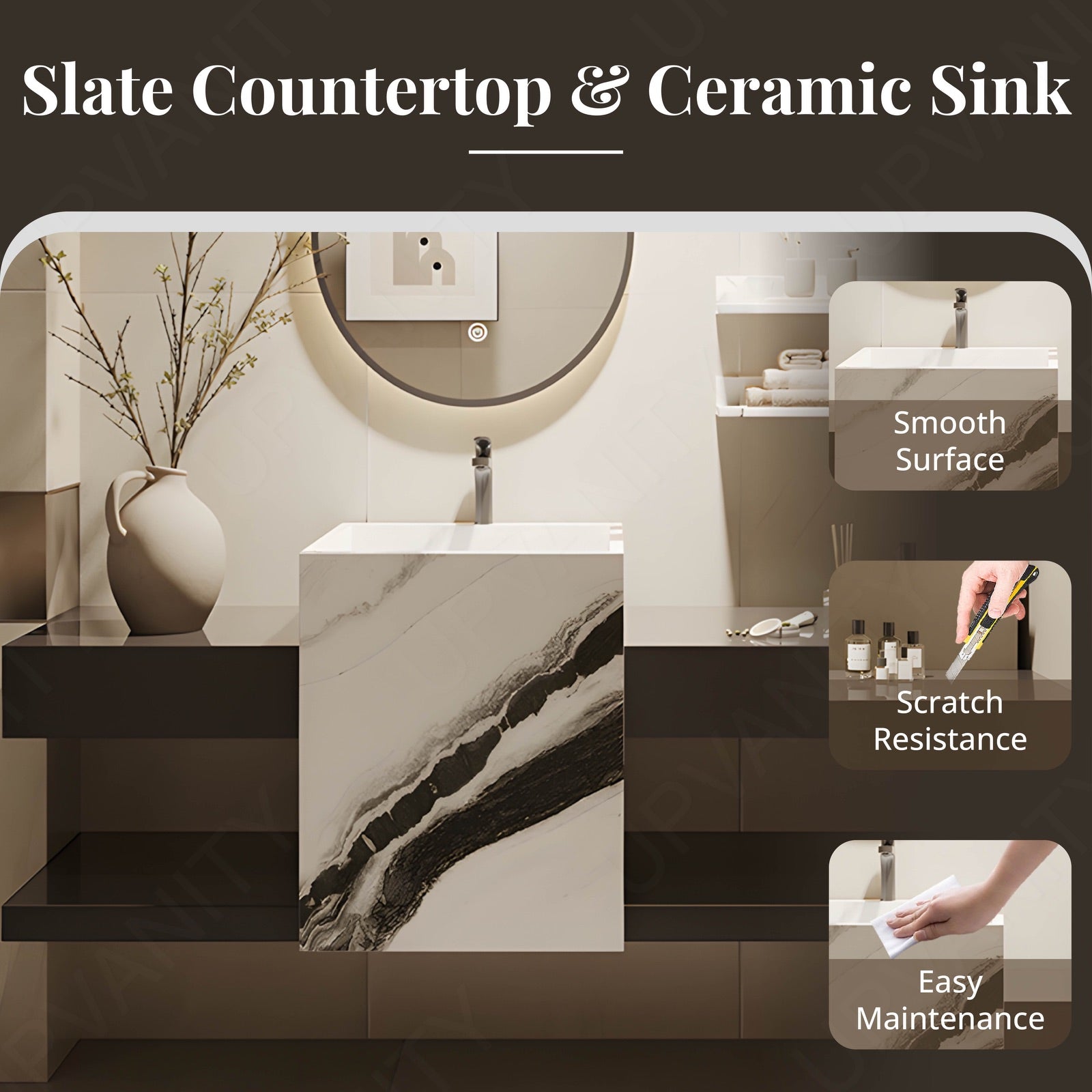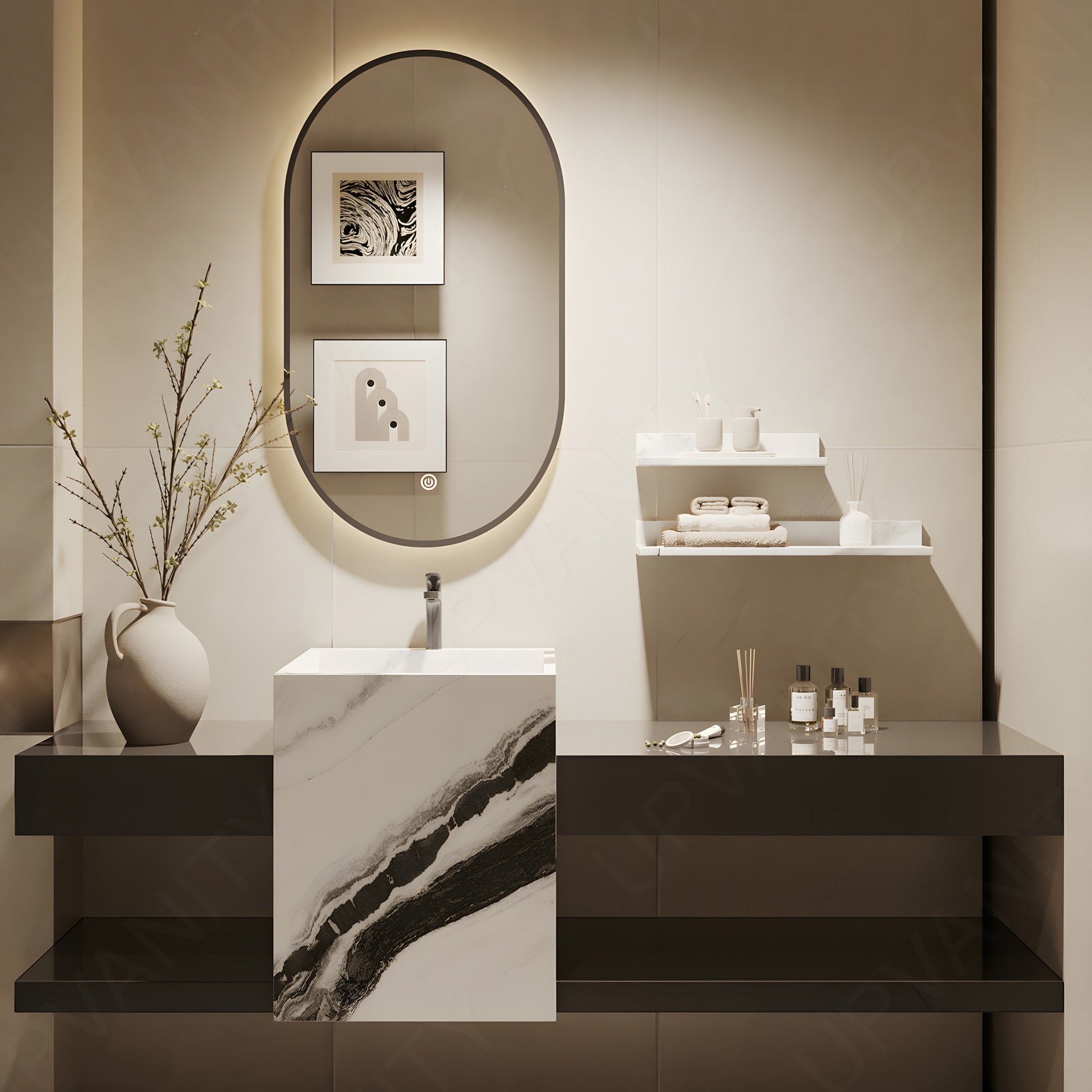 The textured column design defines this brown floating vanity, combining structural artistry with subtle surface rhythm. Its open storage adds visual lightness and practical organization beneath the streamlined form. Finished in a natural brown tone, it balances warmth with refined geometry. The integrated sink enhances daily usability while the oval smart LED mirror provides even lighting and defogging clarity. Every detail reflects durability and minimalist aesthetics tailored for modern bathroom spaces.