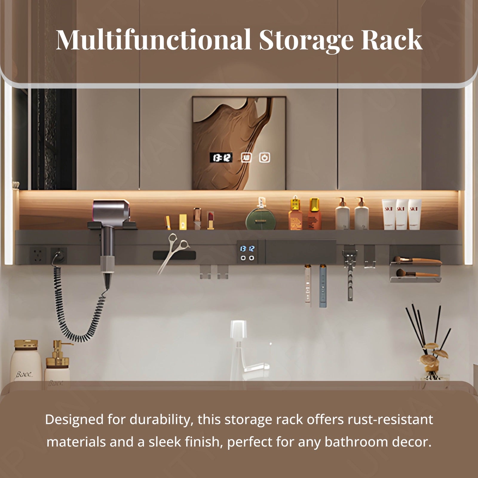 The storage rack below the mirror is multifunctional, with partitions for a hairdryer, toothbrush, skincare products, and more, ensuring everything is within easy reach.