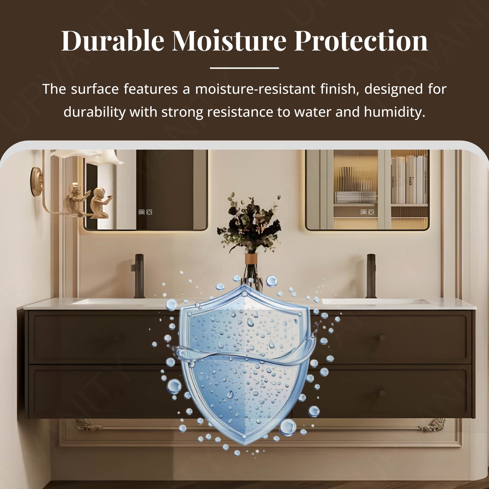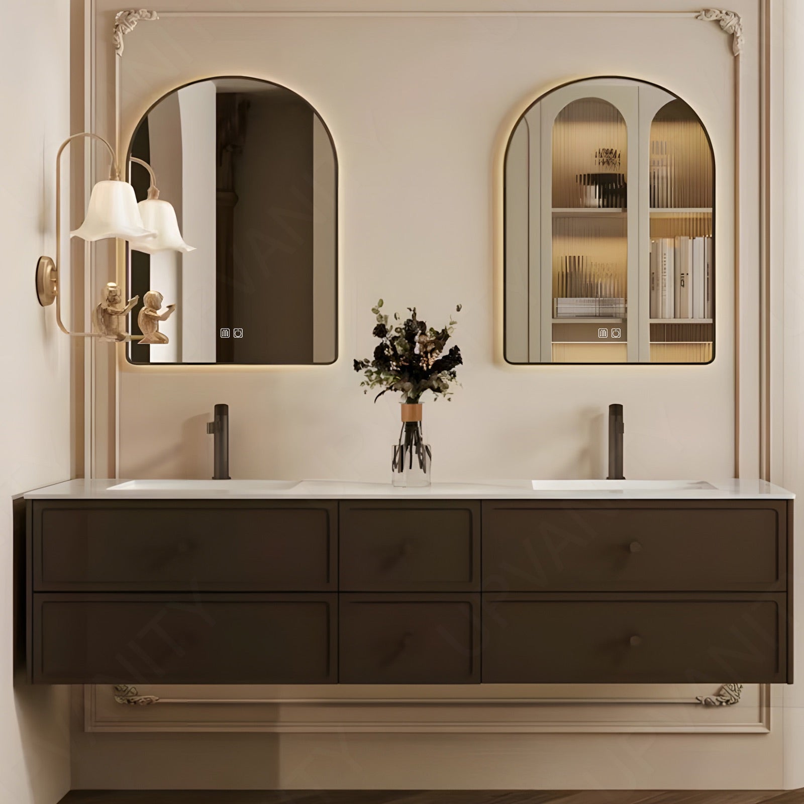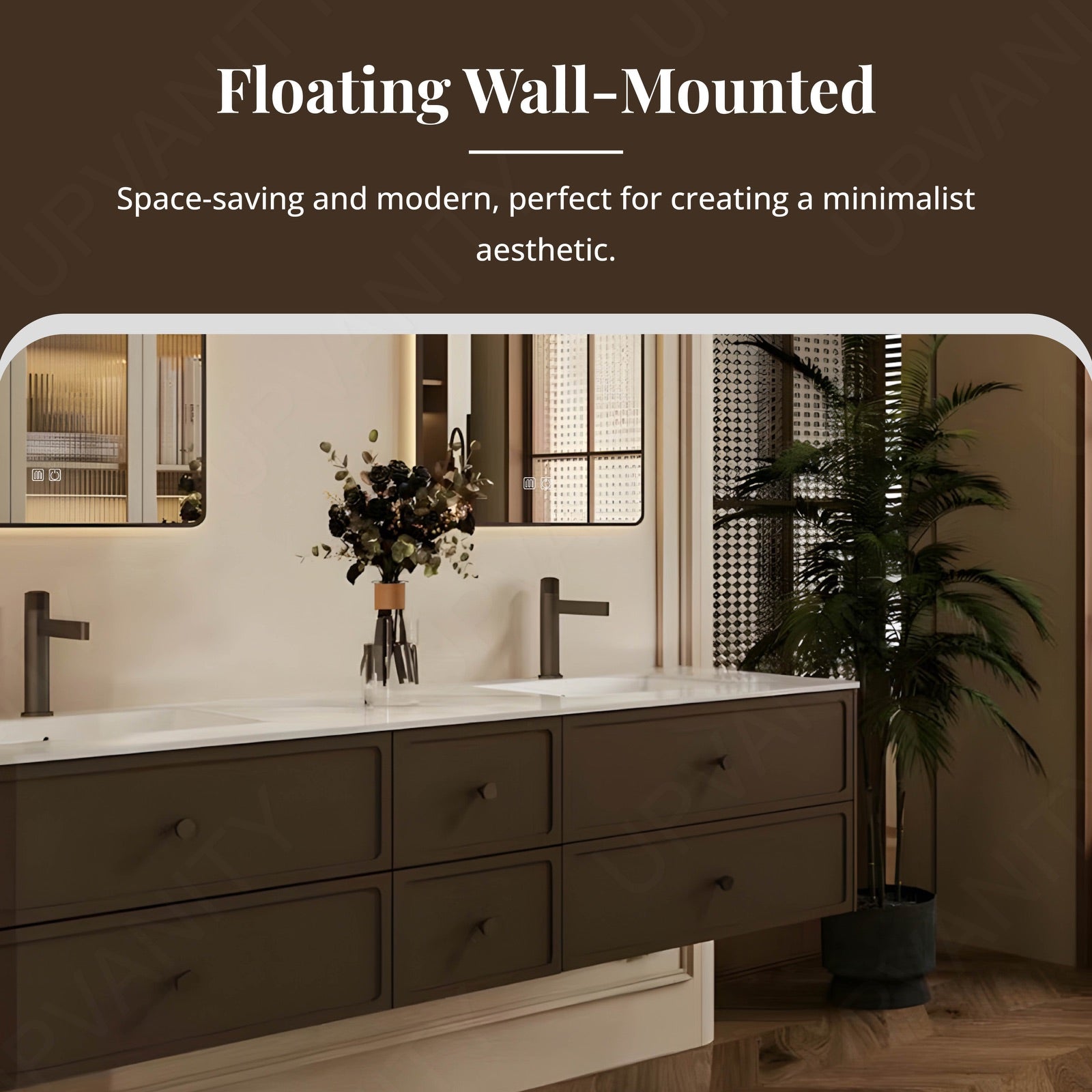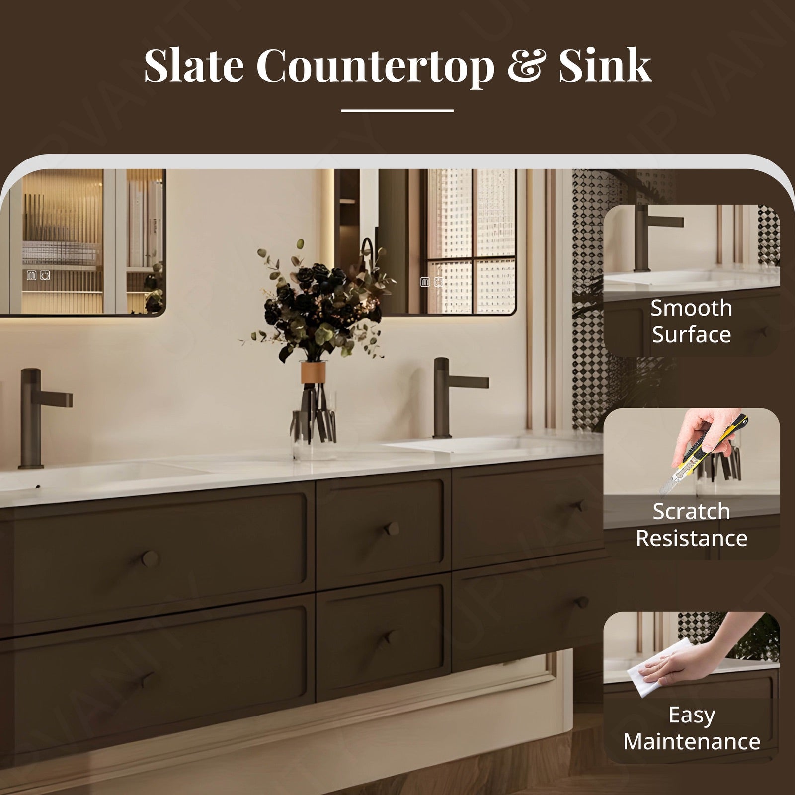 Anchored by a striking white slate countertop that contrasts richly with warm brown cabinetry, this floating vanity merges organic texture with modern utility. The expansive 56"-78" width accommodates dual sinks and sectional storage compartments, while twin smart LED mirrors amplify light and functionality. Designed for busy households, the floating installation enhances floor space, and the natural slate surface resists stains and scratches. Matte brown finishes complement the earthy countertop, and reinforced joints ensure lasting stability. Ideal for contemporary or rustic settings, this set balances rugged durability with intelligent organization, creating a harmonious centerpiece for high-traffic bathrooms.