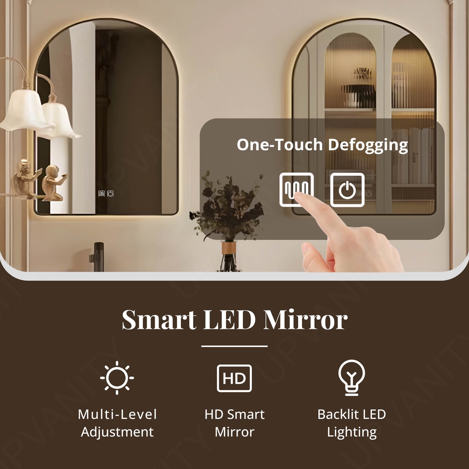 Two frameless mirrors feature adjustable brightness, anti-fog technology, and energy-efficient LEDs for precision grooming and ambient illumination.