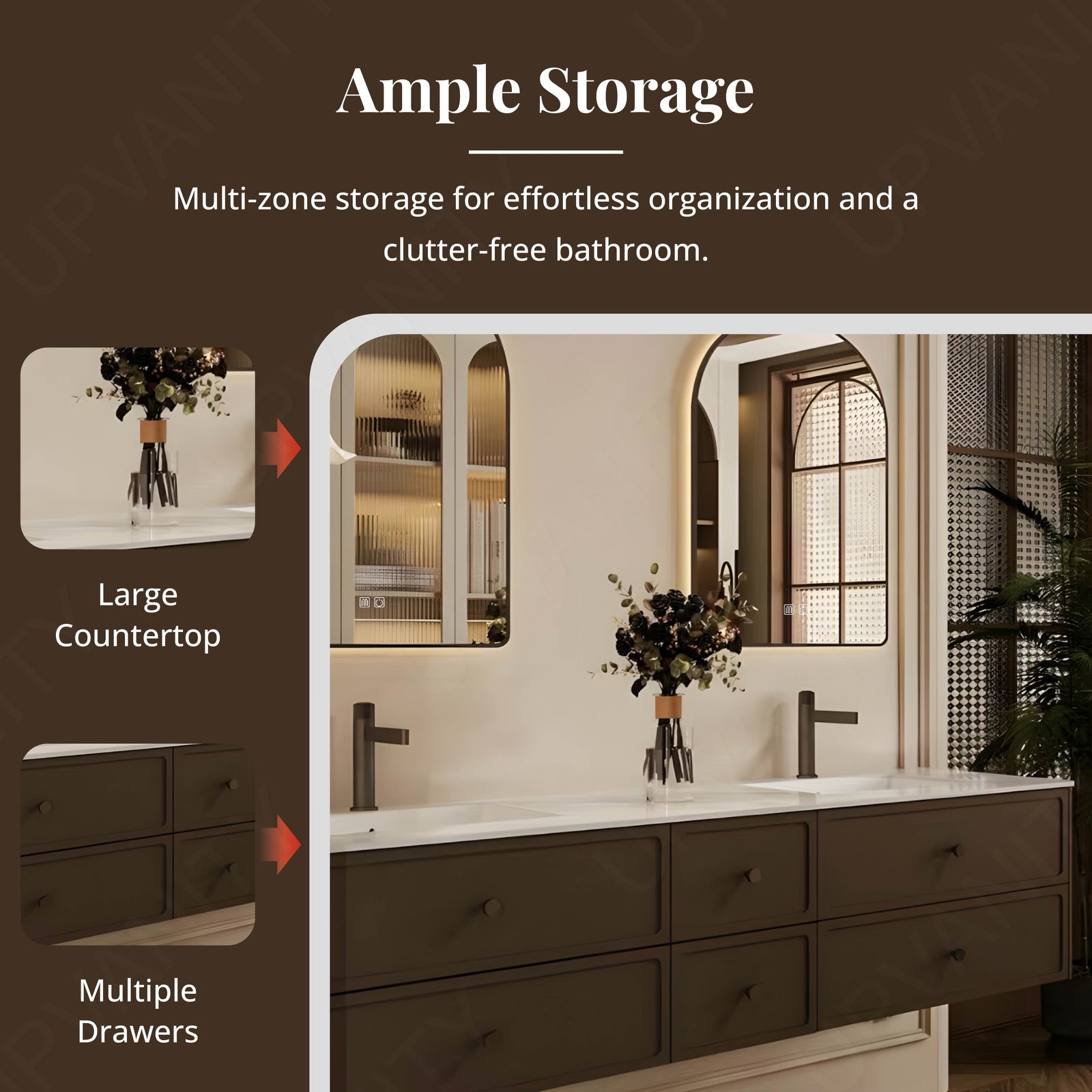 Customizable drawers and open shelving organize toiletries, towels, and cleaning supplies, maintaining clutter-free countertops.