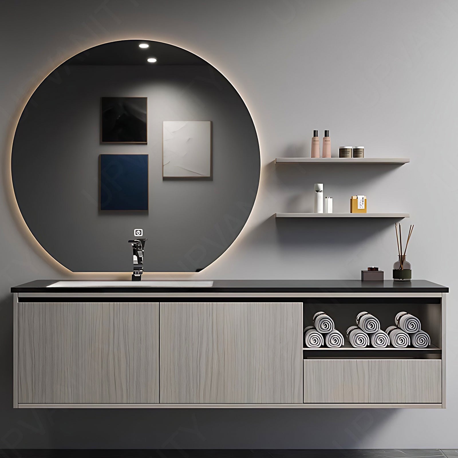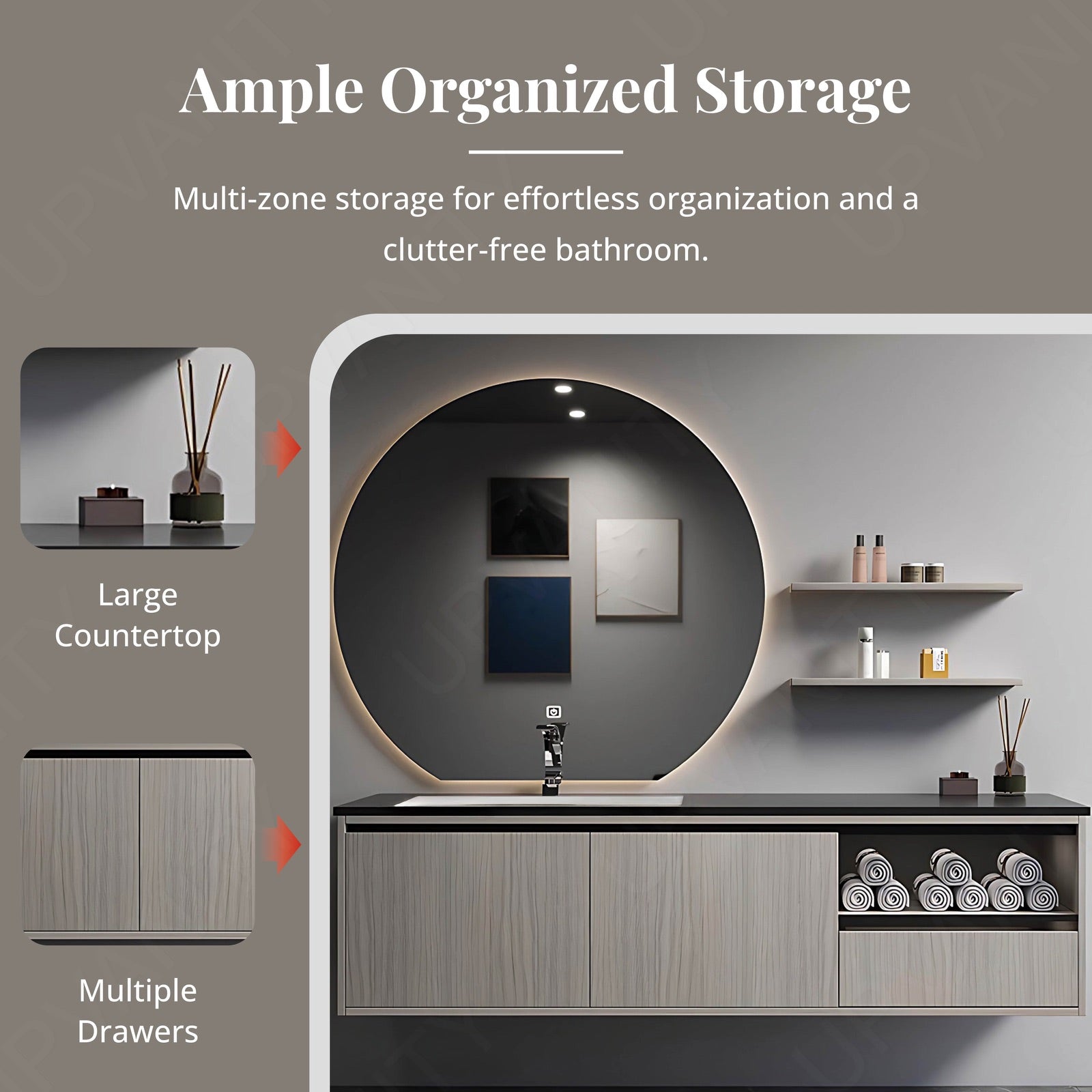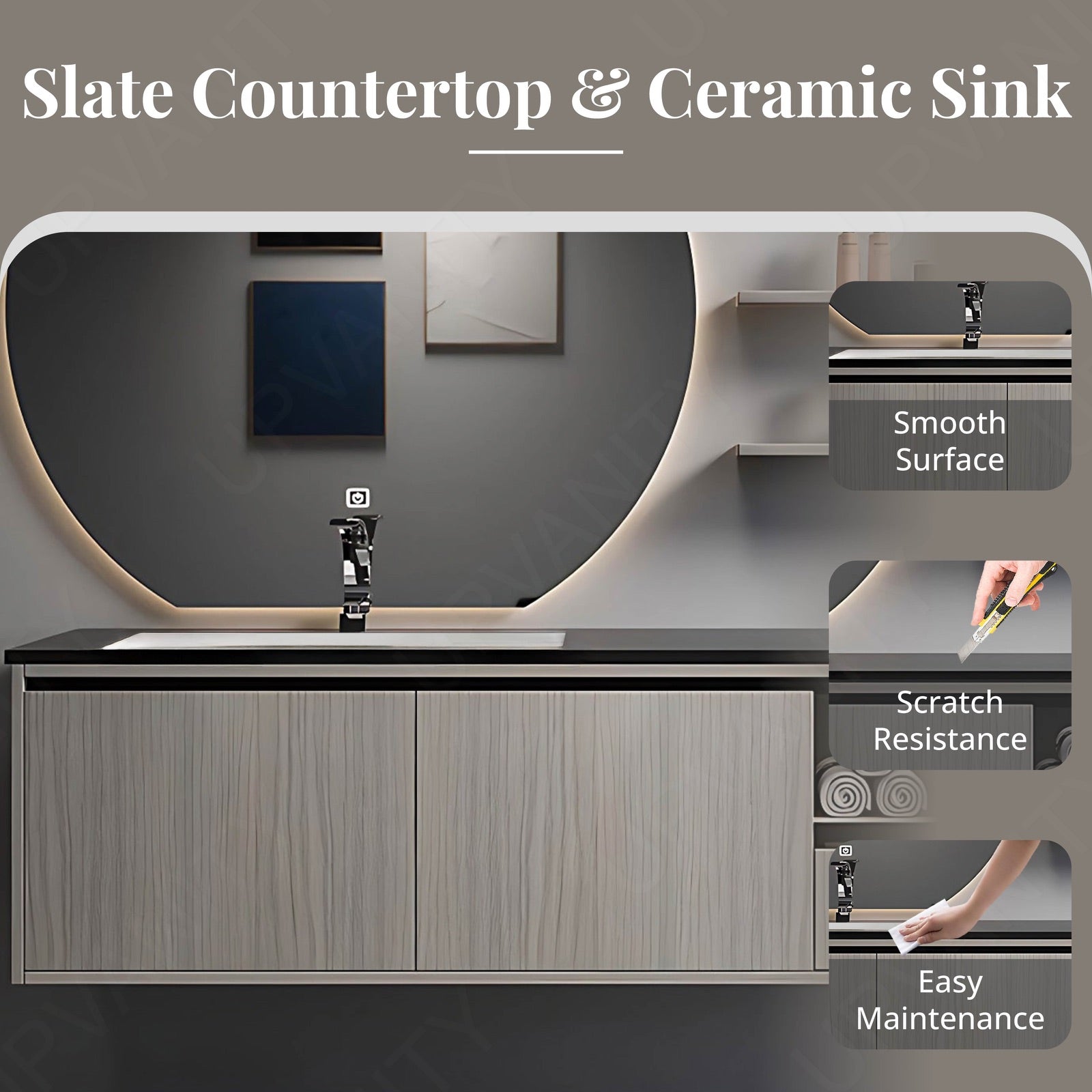The modern design of this gray bath vanity set is accentuated by a sleek black slate top, creating a striking focal point in any bathroom. This floating vanity set features open storage and a round smart LED mirror, blending contemporary style with practical functionality. The single sink design provides ample counter space, while the high-quality materials ensure durability and longevity. Ideal for modern homes, this vanity set offers a perfect balance of aesthetics and utility.