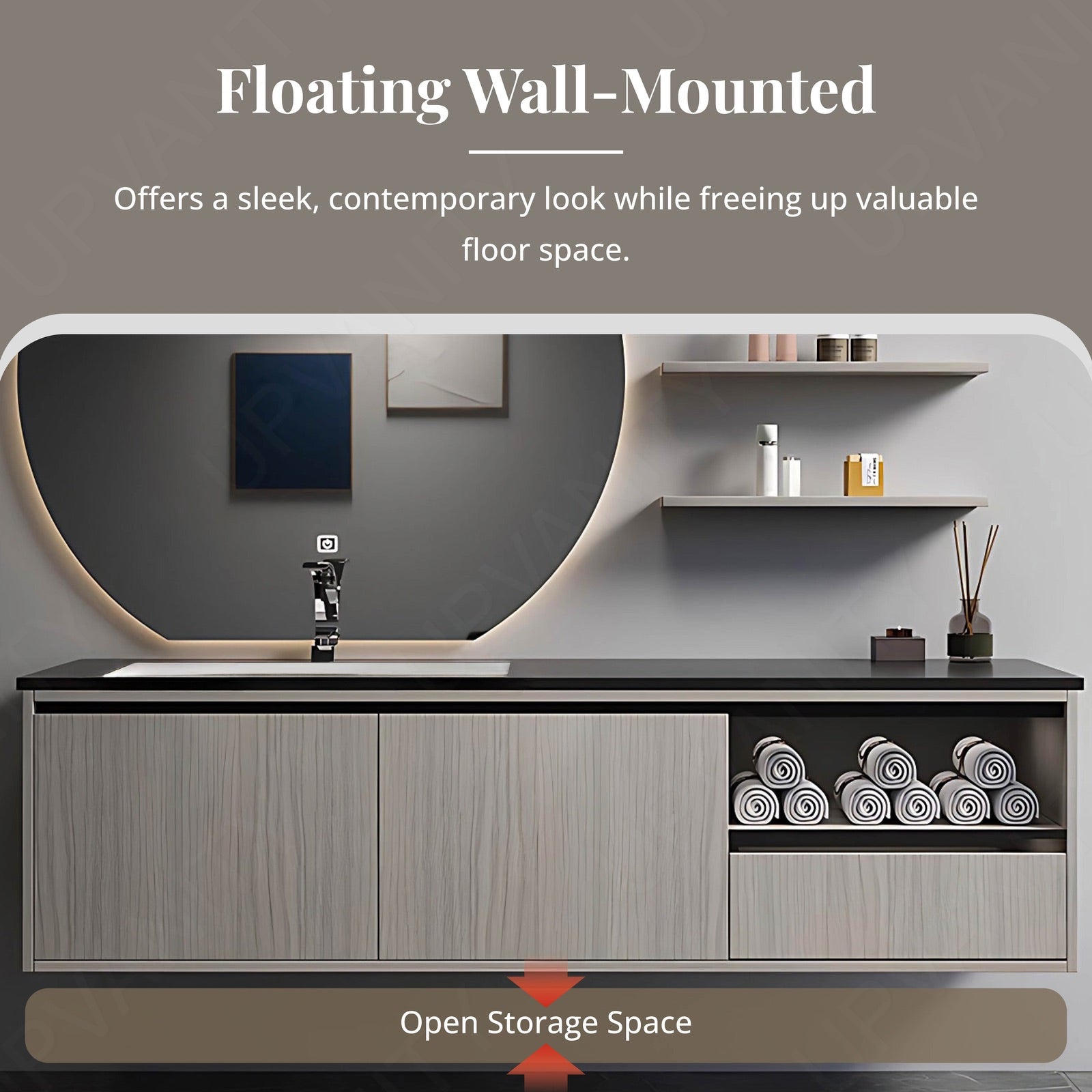 The floating design of this vanity set includes open storage, providing a modern look and practical solution for keeping your bathroom essentials organized and within reach.