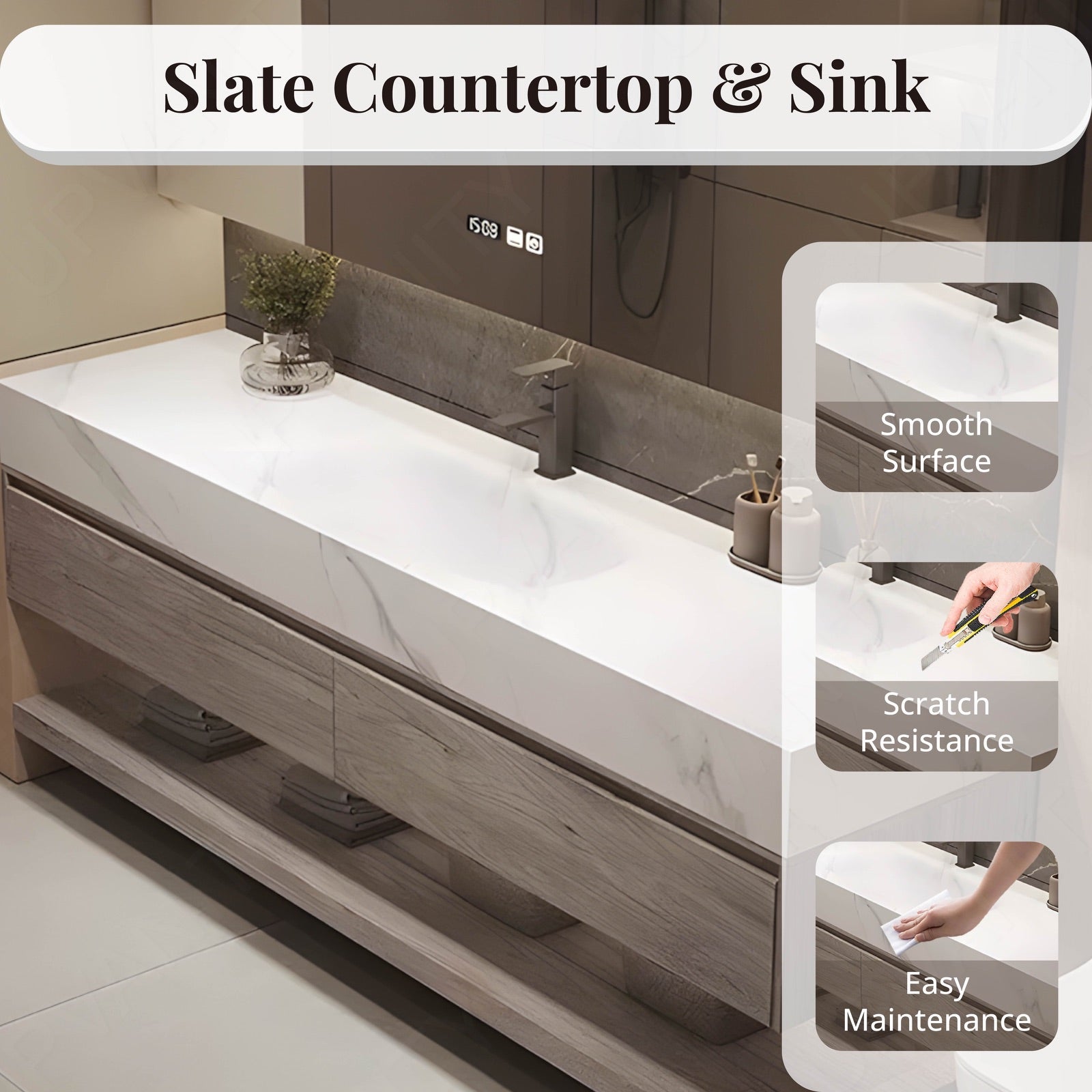 The joint slate countertop offers a seamless and durable surface, providing a refined look that enhances the overall sophistication of your bathroom space.