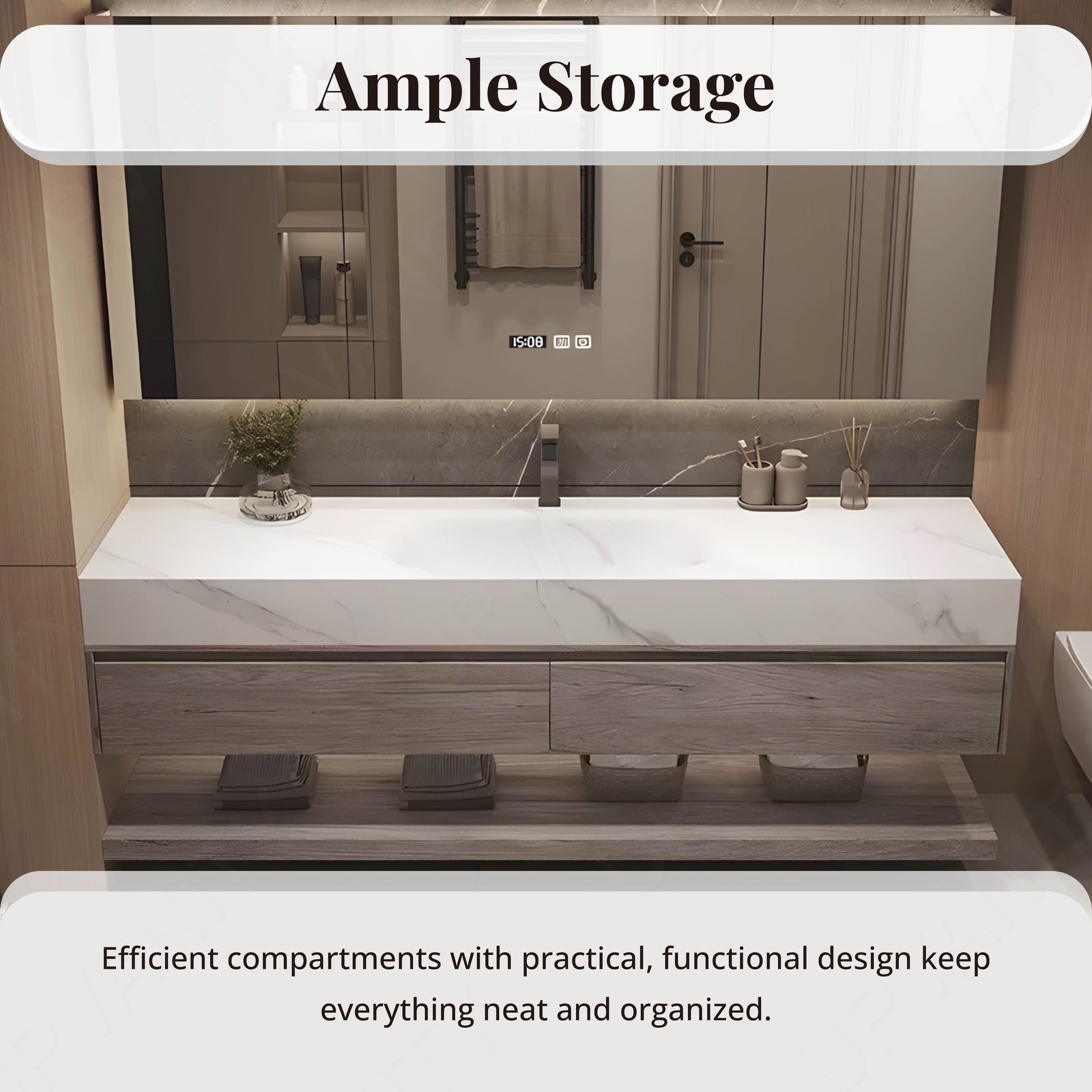 Designed with an open storage concept, this vanity allows easy access to bathroom essentials, ensuring a neat and organized space for your daily routine.