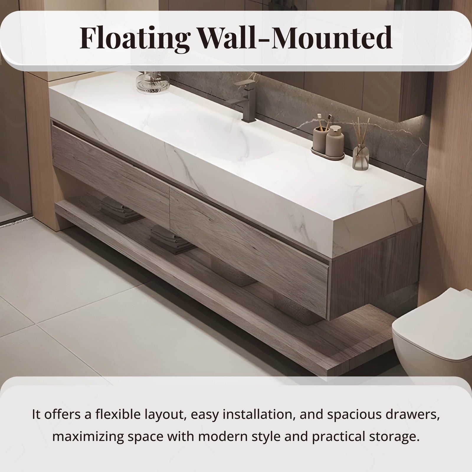 The floating design of this vanity enhances modern aesthetics, creating an open and airy feel while maximizing floor space for a clutter-free bathroom environment.