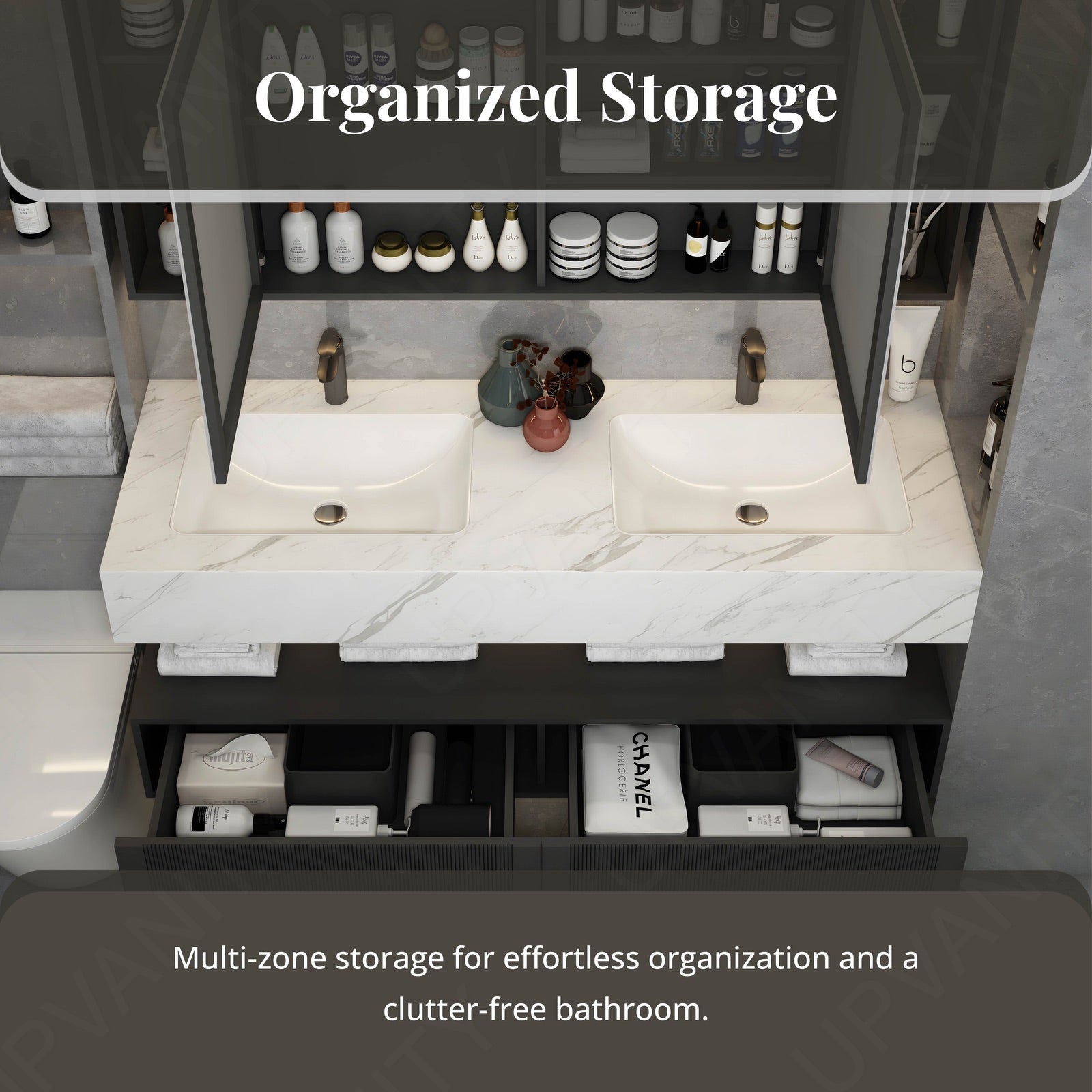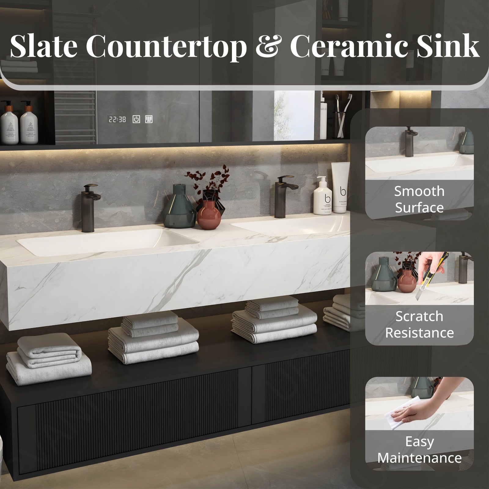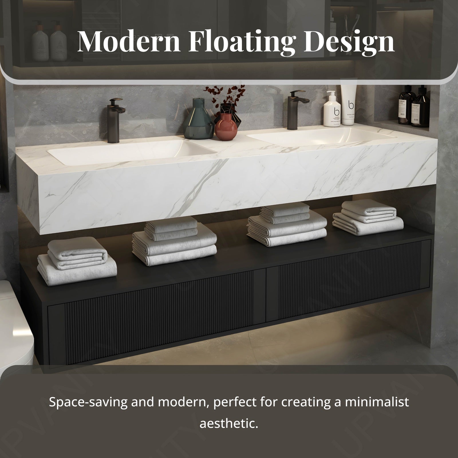 The floating open storage design beneath the split top provides easy access to essentials, combining practicality with sleek aesthetics.