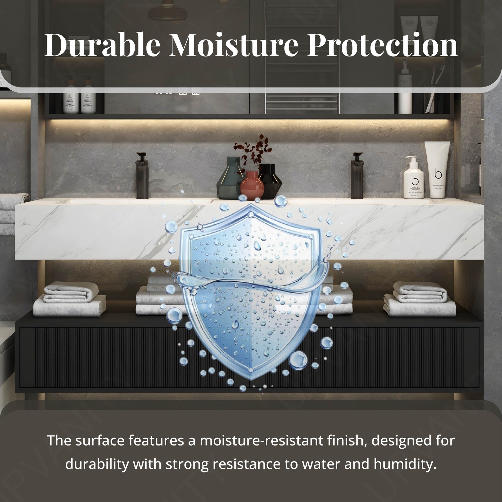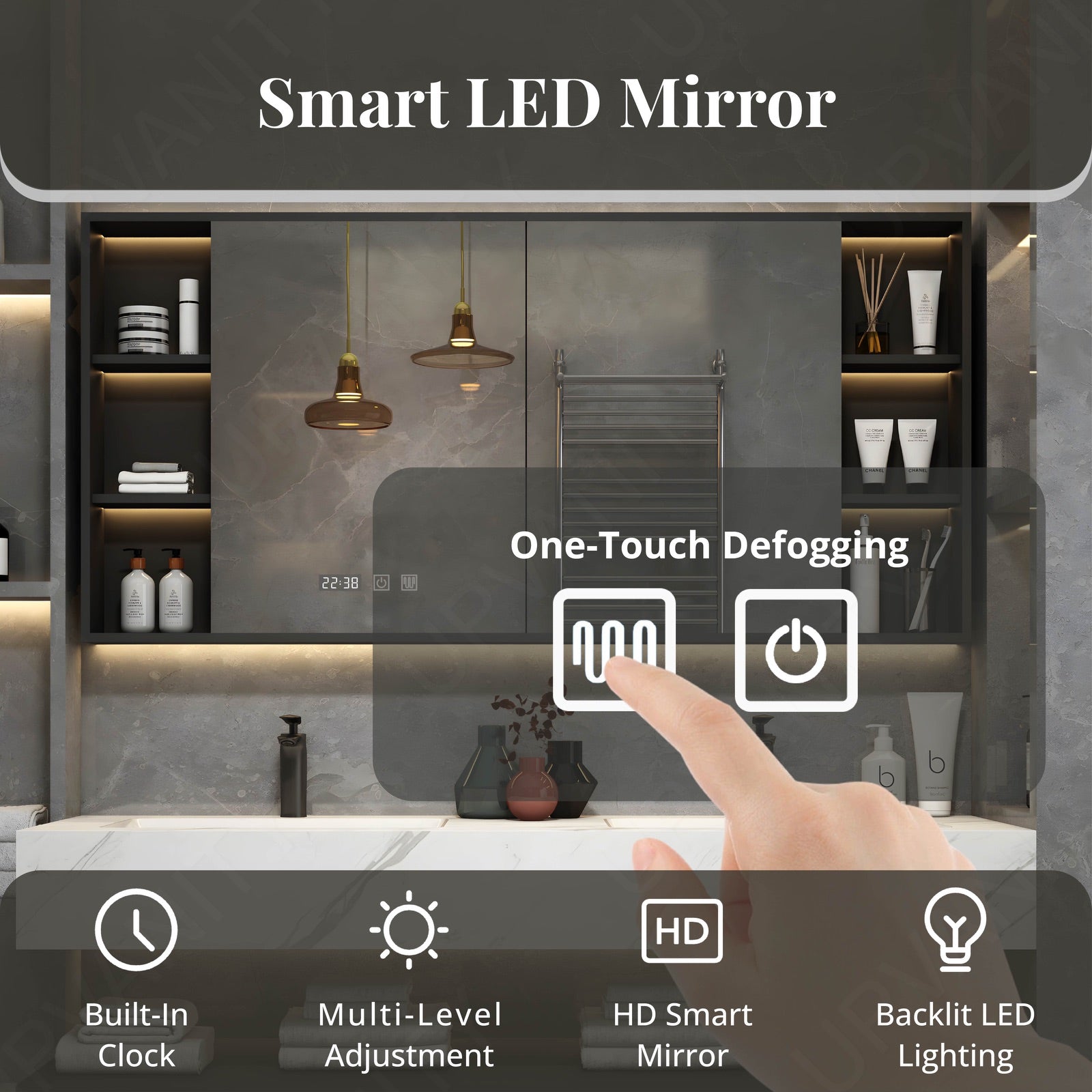 The integrated smart LED mirror adds a touch of modern technology, featuring defogging capabilities for clear visibility, enhancing your daily grooming experience.